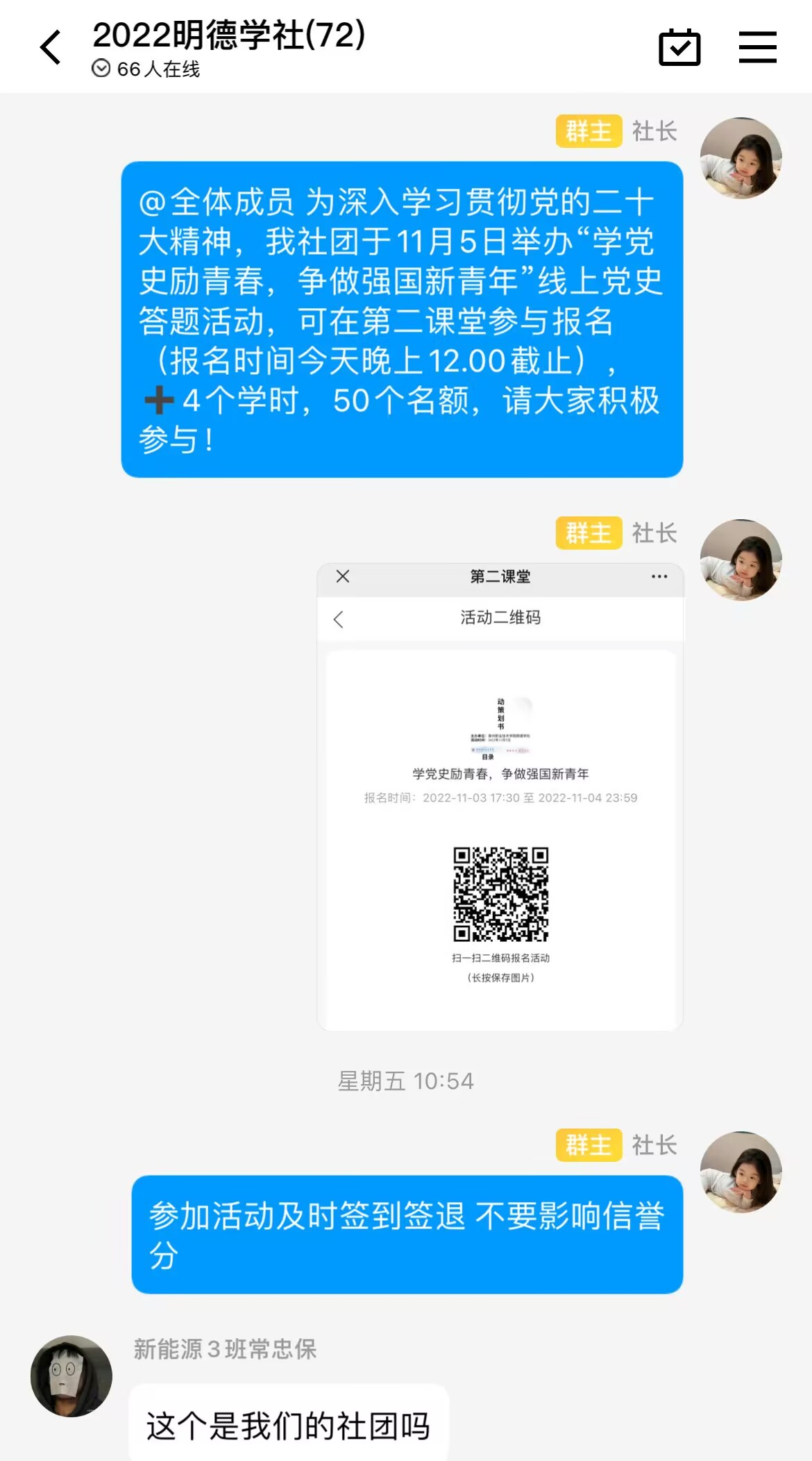 为庆祝党的二十大胜利召开,深入学习贯彻党的二十大精神,进一步引领大学生牢记初心使命,永远跟党走,奋进新征程,明德学社于2022年11月5日开展“学党史励青春,争做强国新青年”线上党史答题活动。