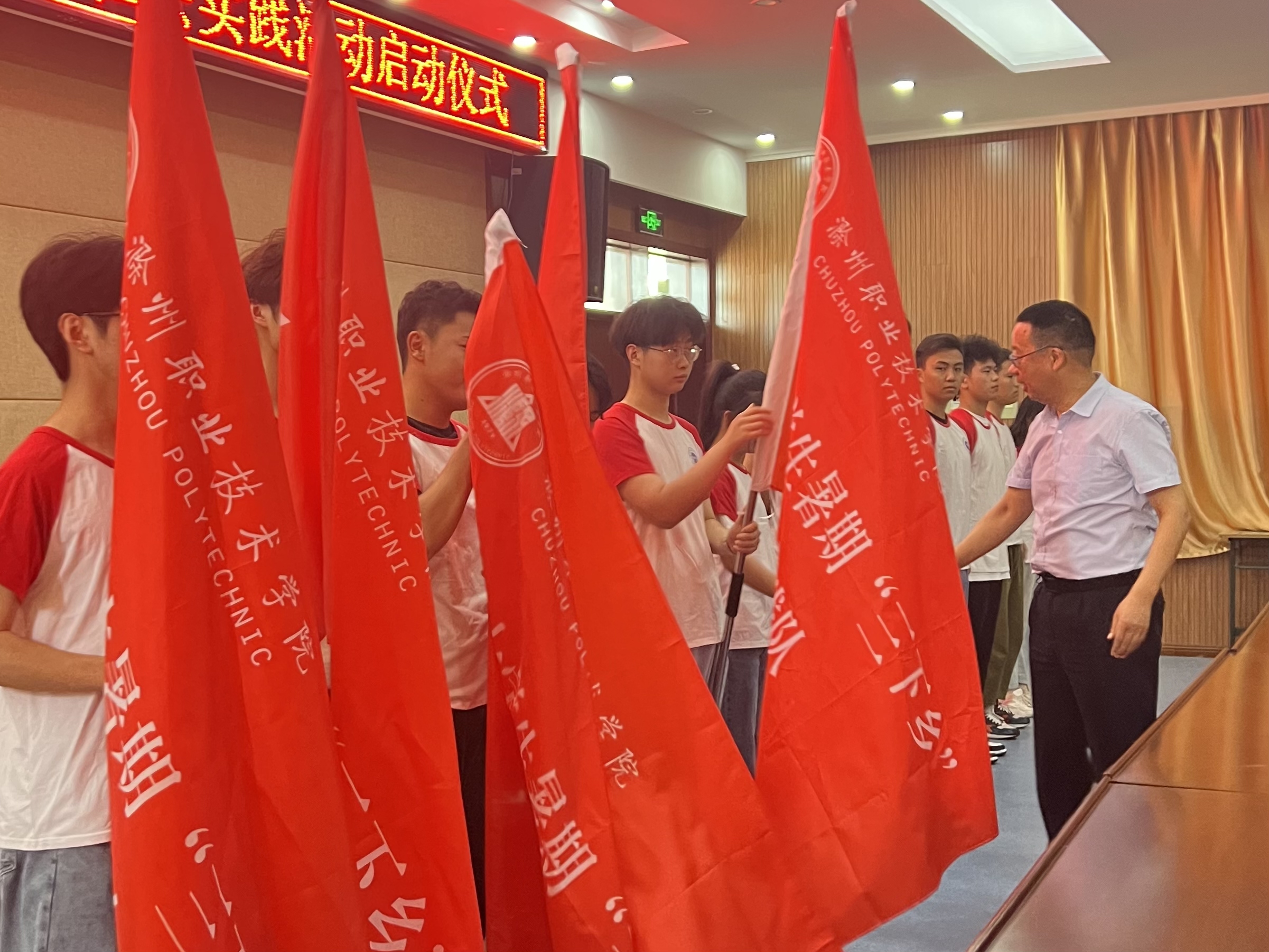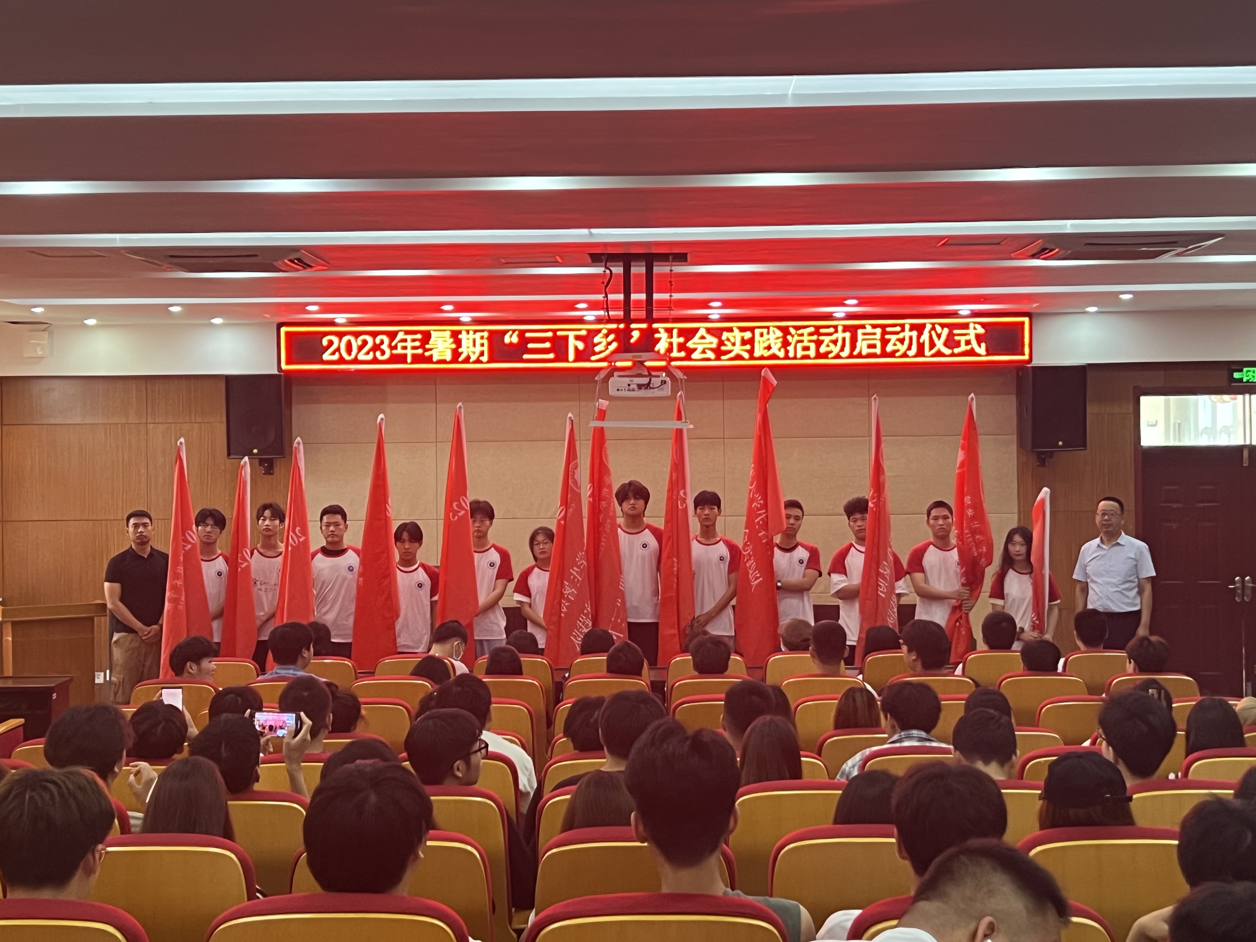 校党委委员李平权为各学院“实践队”授旗。实践队员表示会接续责任和使命,发扬“弘德致远 修能致用”的精神,在社会课堂中躬身实践、砥砺奋斗。
