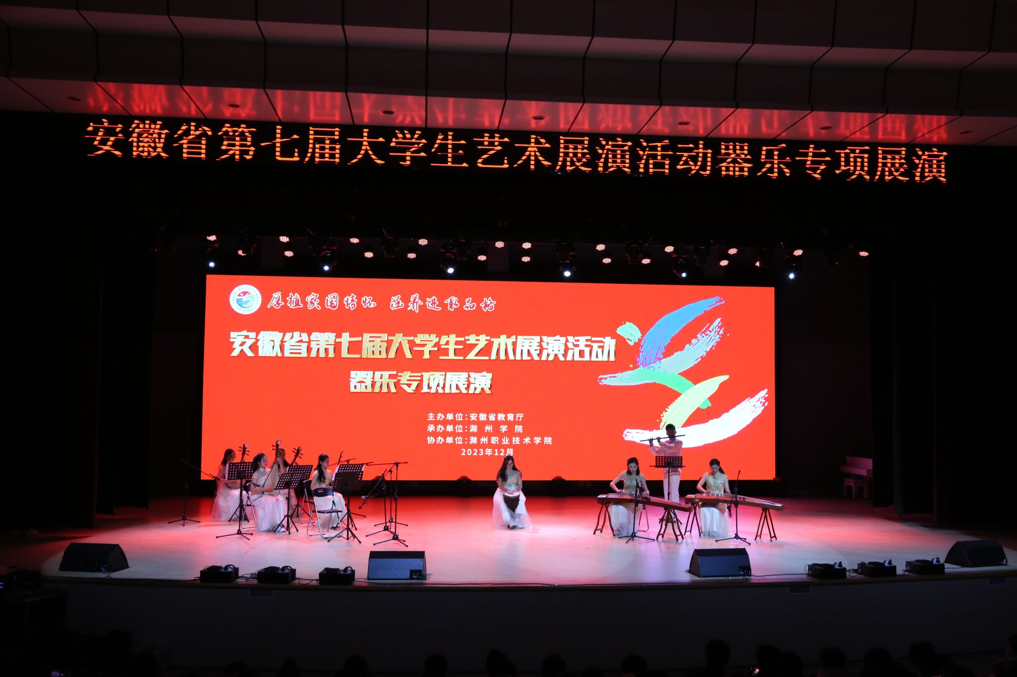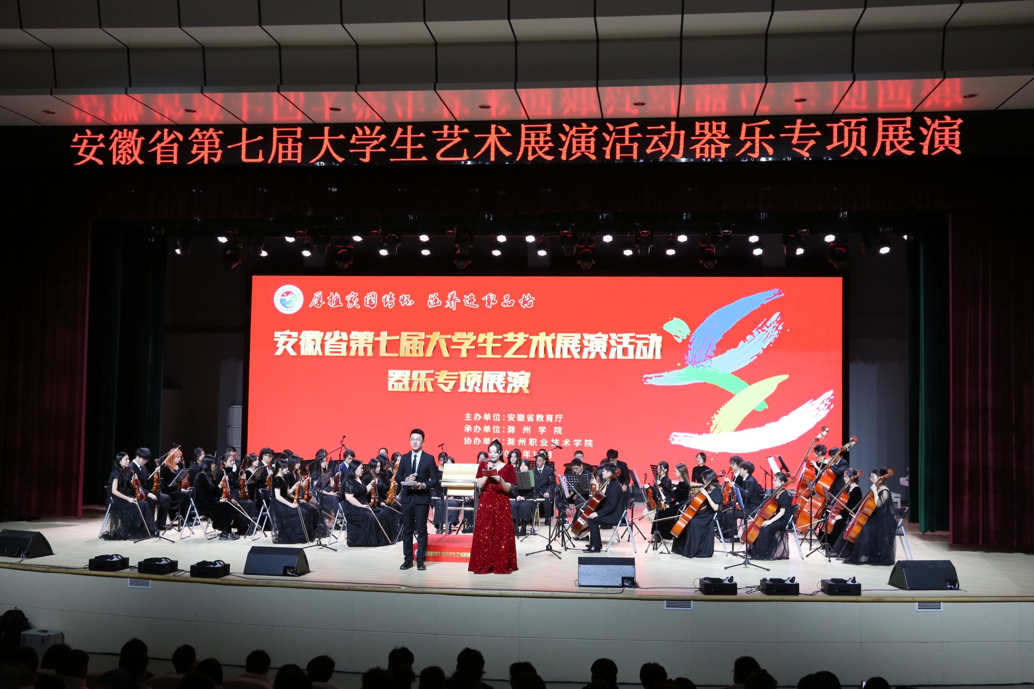 12月17日下午,由安徽省教育厅主办、滁州学院承办、awc777万象城娱乐官网协办的安徽省第七届大学生艺术展演器乐专项展演在awc官网学术报告厅隆重举行。安徽省教育厅体卫艺处处长葛德连,滁州学院党委副书记、校长郑朝贵,awc777万象城娱乐官网党委书记曹付忠,awc777万象城娱乐官网党委委员、工会主席李平权以及省内9所高校900余名师生出席本次活动。