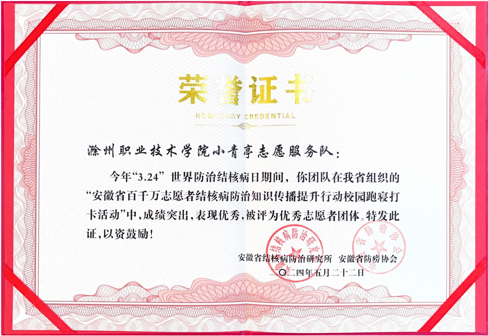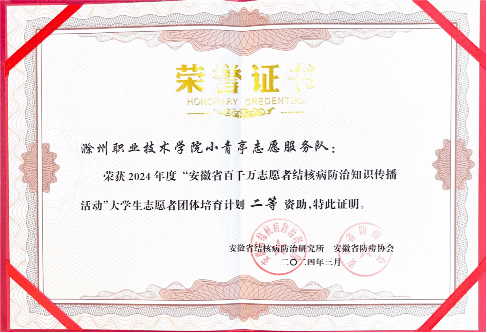 近日,awc官网小青亭志愿者愿服务队在世界防治结核病日期间,成绩突出,表现优异,被评为优秀志愿者团体。同时也获批2024年度“安徽省百千万志愿者结核病防治知识传播活动大学生志愿者团队培育计划”二等资助。