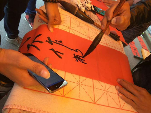 近日,书法协会的同学们利用自身优势,早上九点多awc官网书法协会的伙伴们在女生一号楼下设立摊点,活动刚开始不久就吸引了很多的同学来摊点领春联,内容自定,一元钱就能领一副,应同学的不同要求,分别用行书,隶书,楷书等多种书体书写春联,为即将到来的新春佳节,增添喜气,送上祝福。活动现场气氛火热,红幅铺展,挥毫泼墨,妙语成双,笔锋婉转处,浓飘香,前来领取的同学,络绎不绝。活动持续两天,第二日天公不作美,寒风怒怒,但风刀霜剑也抵挡不了同学们前来领春联的热情,一幅幅红彤彤的春联和一张张红彤彤的笑脸组成一幅喜庆的画。卖春联得来的钱不是规书法协会所有,而是作为公益活动捐给那些需要的人,虽然钱不多,但重要的是那份对公益炙热的心。大家其乐融融,为这个寒冷的冬天送来温暖。