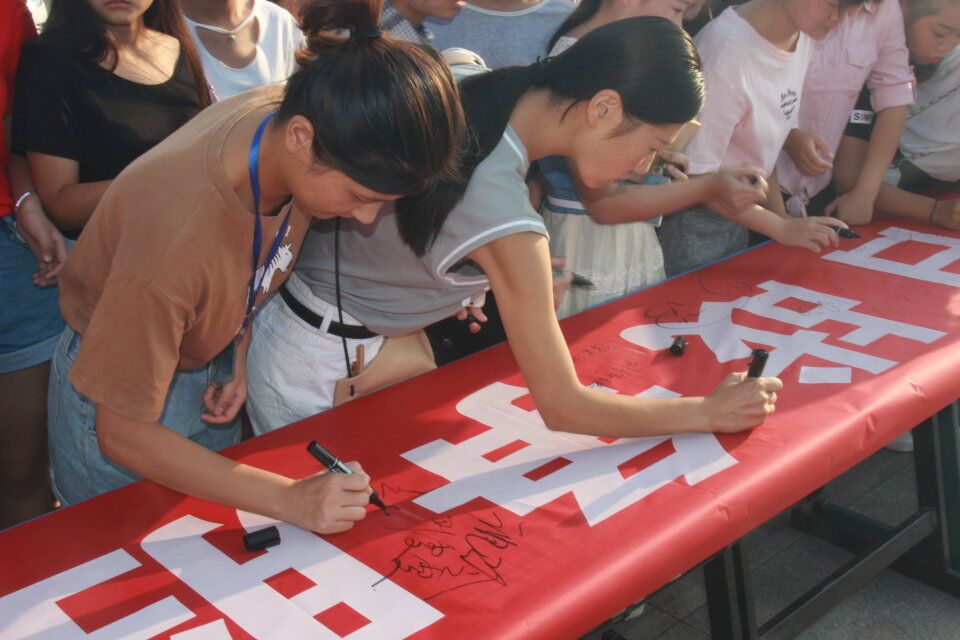 升旗仪式后,学生们纷纷在纪念抗战胜利71周年的横幅上签名。