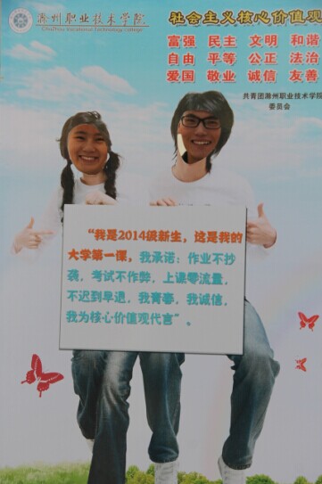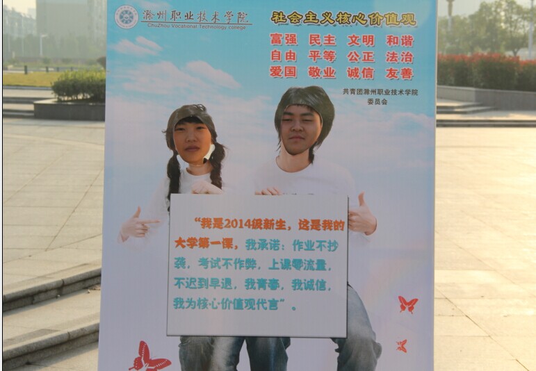 10月8日一早,awc777万象城娱乐官网2014级新生在结束为期两周的军训后,开始了他们大学的第一课。当新生们路过教学楼时,惊喜的发现院团委的老师们给新生准备的开学第一课“礼物”——核心价值观代言墙。两个打扮青春的人偶矗立在教学楼入口处,上面清晰的标注着社会主义核心价值观“富强、民主、文明、和谐;自由、平等、公正、法治;爱国、敬业、诚信、友善”。