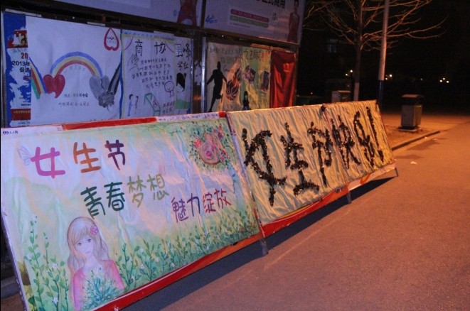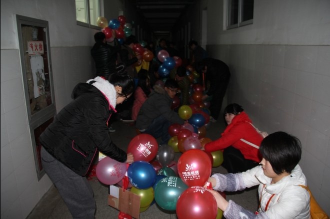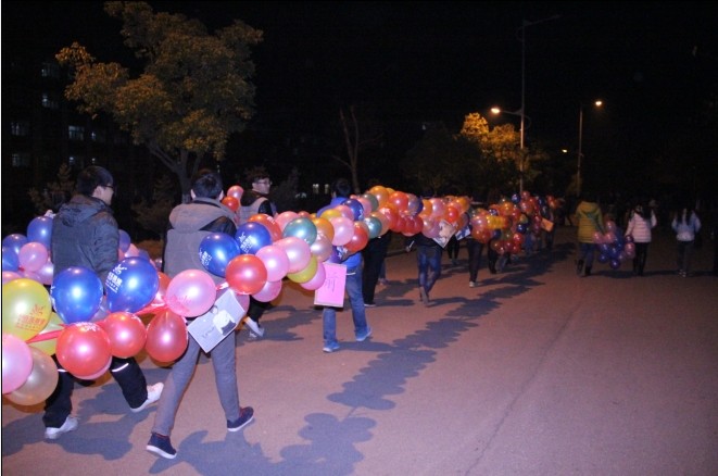 美好的祝福愿望伴随着早春的露珠在清晨得到了传递,为了给全院女生们一个惊喜,3月6日晚十点院学生会全体成员积极忙碌着打扮起了校园。一瞬间,校园里一棵棵树上挂满了彩色的气球,工作人员把女生们喜爱的人物图片和树叶拼出“女生节快乐”文字安置在女生宿舍楼下展出,女生宿舍大门也用气球和彩带装饰了一番,只等着黎明的到来。