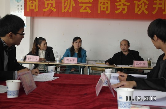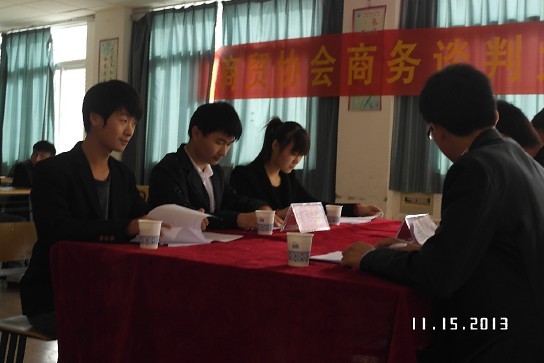 比赛以三人抽签组队模式采用社会上的实事案例作为谈判内容,经过激烈的初赛,最终有6人参加决赛。决赛于11月15号在机电系5403教室举行,商贸协会辅导老师梁金荣、陈中胜老师及社团联合会第六届副主席杨春雪同学担当评委。