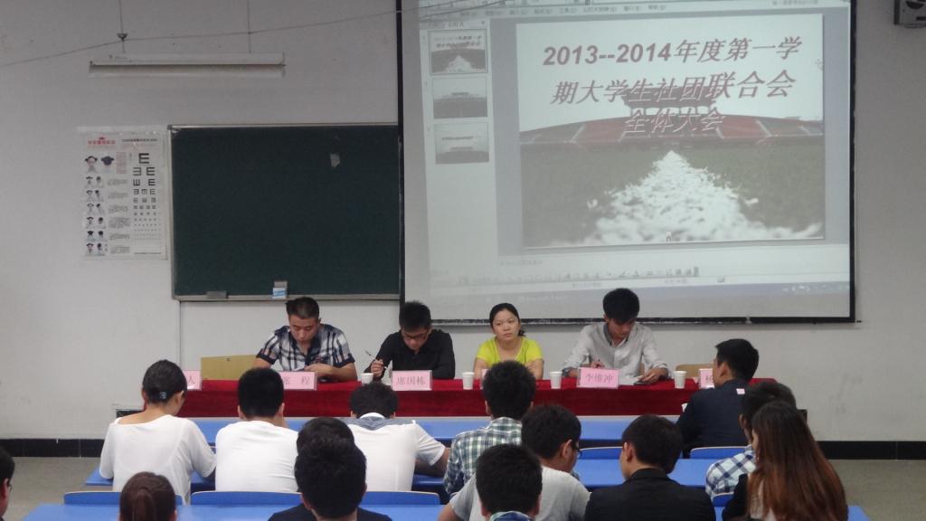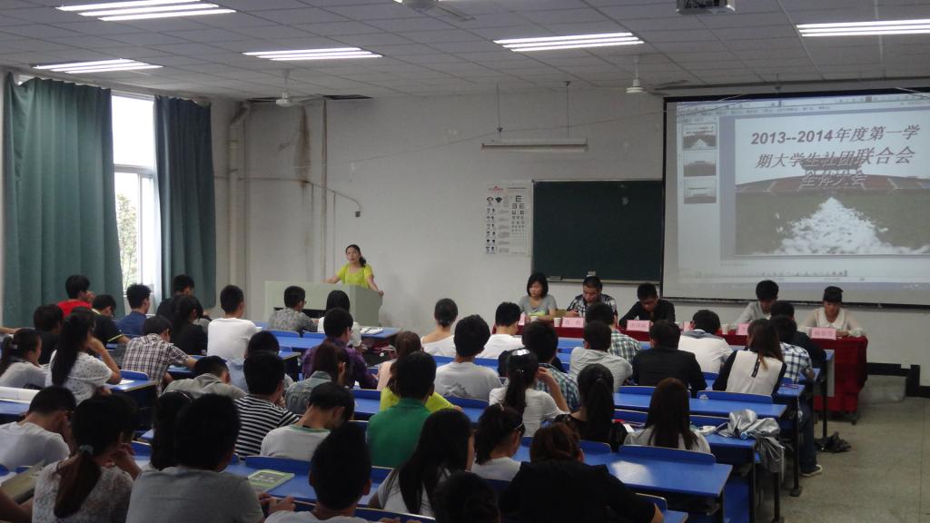 9月11日12点30分,我院2013—2014 学年度第一学期大学生社团联合会全体大会在北阶206成功召开。参加本次大会的有院团委程诚副书记,院学生会主席李维冲,社联主席习国栋、副主席杨春雪、张程,社联各部部长和各社团代表。