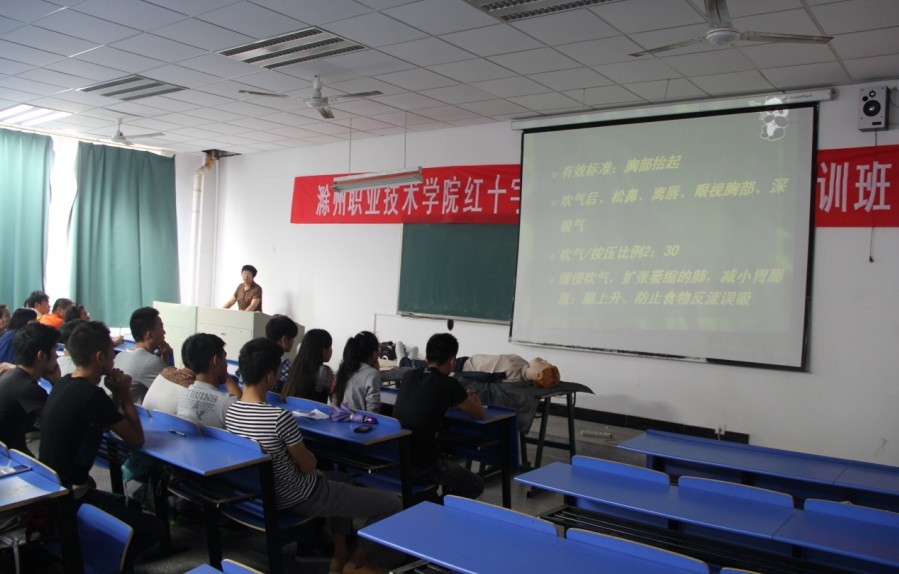为了提高应急救护知识在我院的普及率,增强学院师生应对突发灾害的能力和保护生命与健康,及响应2013年“世界急救日”主题宣传活动,院红十字会在9月11日下午联合滁州市红十字会举办了应急救护培训班。出席本次培训班的有市红十字会司明华、院团委书记王蓓蓓,院团委副书记刘杰、院红十字会指导老师何文婧以及各系部红十字分会会员代表等。