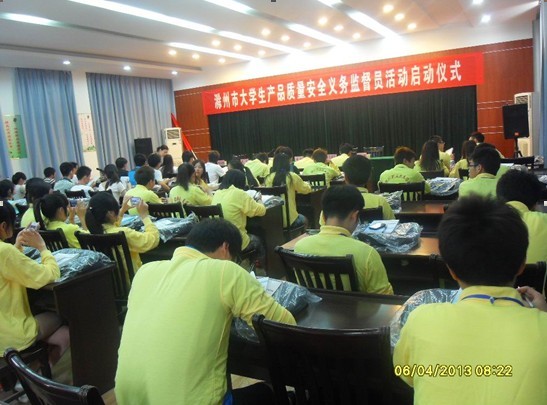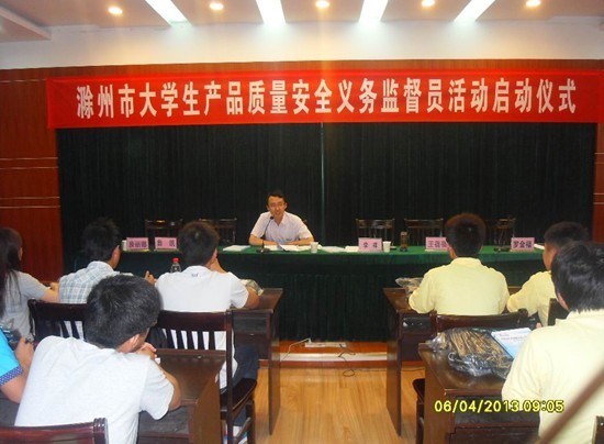 2013年6月4日上午,滁州市大学生产品质量安全志愿服务活动启动仪式在市质监局举行,市委常委、副市长王图强、市质检局局长李祥、市团委副书记鲁凯、我院团委书记王蓓蓓等领导参加启动仪式,来自滁州职业技术学和滁州学院等高校的61名大学生被聘担任质量安全志愿监督员。