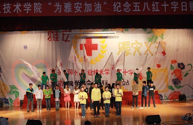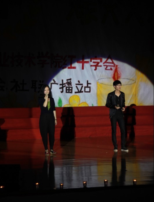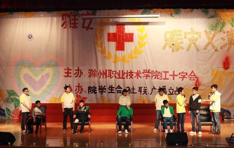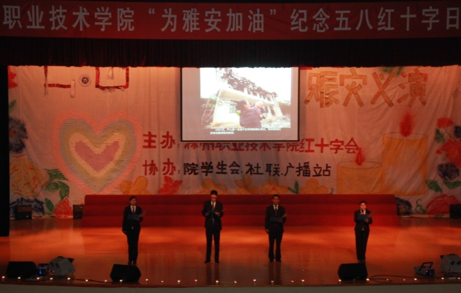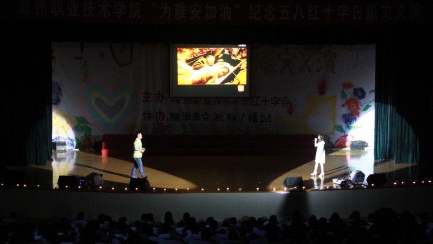 “我和你一样,一样的坚强,一样的全力以赴追逐我的梦想”——由院红十字会主办、院学生会、社团联合会、广播站协办的“为雅安加油”纪念五八世界红十字日赈灾义演晚会于5月8日下午2点和晚上7点在我院大楼报告厅分两场举行。学院党委委员、副院长、院红十字会会长吴大明、南谯团区委书记张伟、南谯团区委副书记戴莺、琅琊团区委副书记施成虎、院学生处副处长温江涛、张军、院思政部副主任李爱红、院团委副书记刘杰、程诚及各系部团总支书记出席此次活动。院红十字会会长吴大明代表学院红十字会致辞。