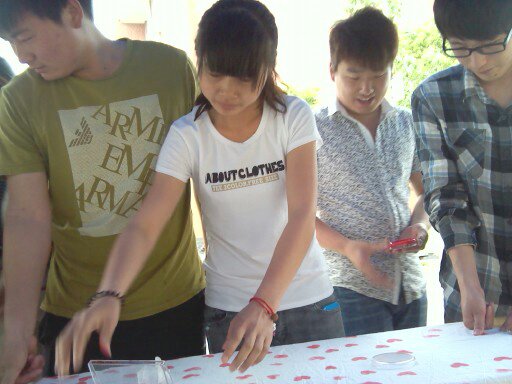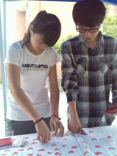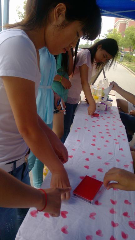 5月15日,在院团委、学生处的大力支持下,我院心理协会,在一号宿舍楼下,开展了名为“爱心传递手印心连心”的活动。该活动体现了本月心理健康宣传的主题“珍爱生命,责任同行”,活动以四川雅安地震为活动主题,通过将拇指手印,在白色的布面上印出心形,让同学们在参与活动的同时,寄托一份对四川雅安灾区遇难者的哀思,在活动现场,同学们积极参与,活动有序进行。