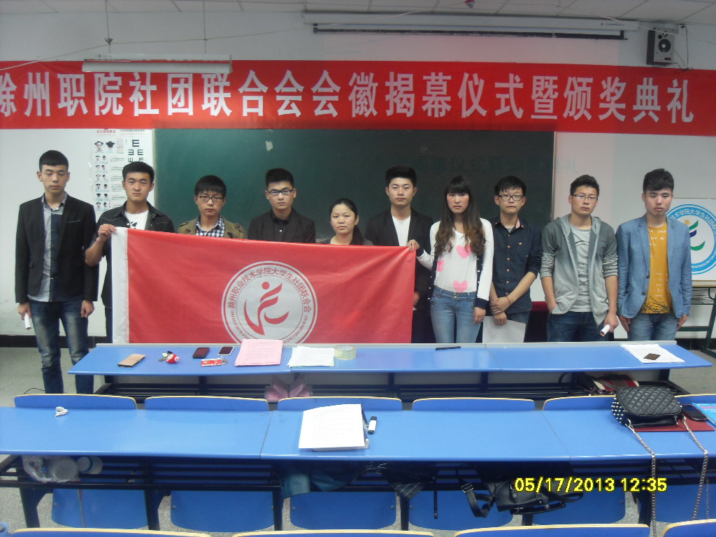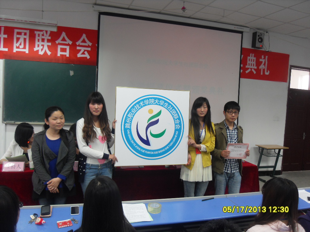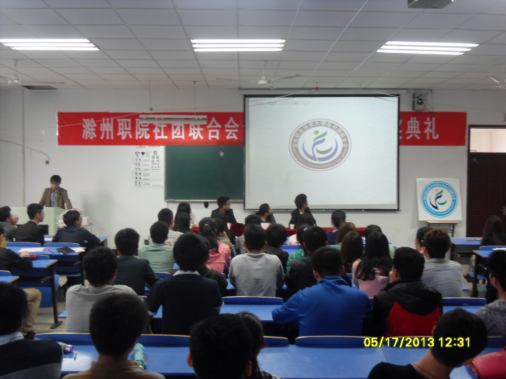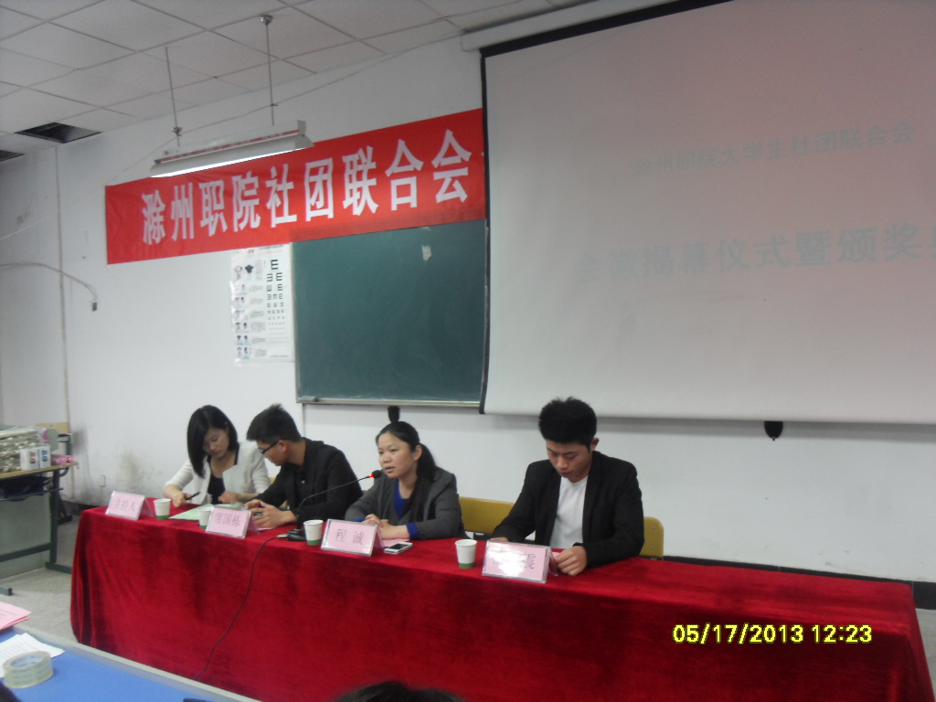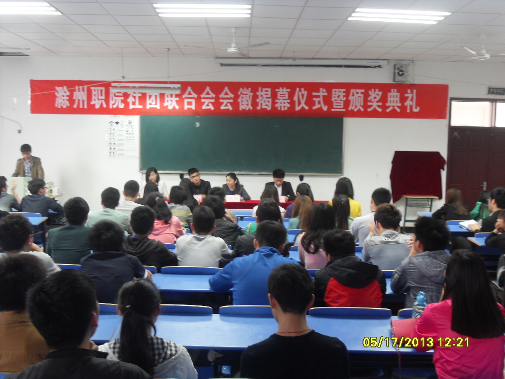 5月17日中午12:00在北阶206举办了滁州职院大学生社团联合会会徽揭幕仪式暨颁奖典礼。此次活动到场的有院团委副书记程诚、学生会主席檀震、社联主席席国栋、社联全体成员、各社团代表及各位获奖同学。