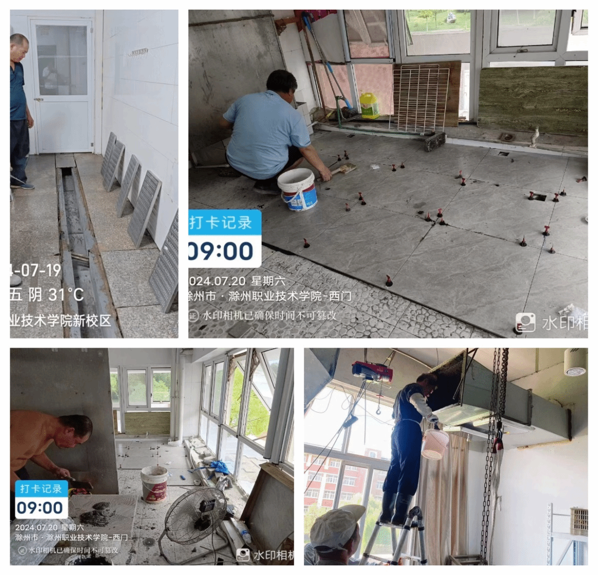 暑期各项维修工作紧锣密鼓开展,时间紧、任务重,维修人员战高温、斗酷暑,完成食堂、宿舍、浴室、超市、快递站等服务场所升级改造和维修工作,并配合完成公寓日常水、电、木、土及公寓楼整修工程,做好各公共场所消毒、消杀等工作。