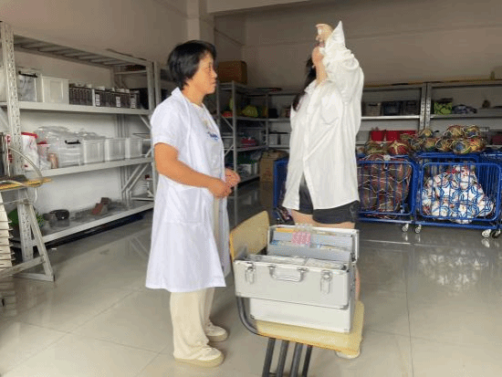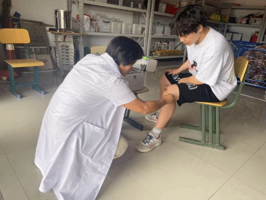 测试期间,健康驿站医护人员全程驻守田径场等测试区域,为学生提供健康咨询和运动损伤应急处理服务。针对体测期间出现的肌肉痉挛、低血糖、意外擦伤等突发状况,医疗团队第一时间开展冰敷镇痛、补充糖分、消毒止痛等专业处置,确保学生生命健康安全。此外,健康驿站还在现场普及科学运动知识,引导学生树立“安全第一、科学锻炼”的健康理念。