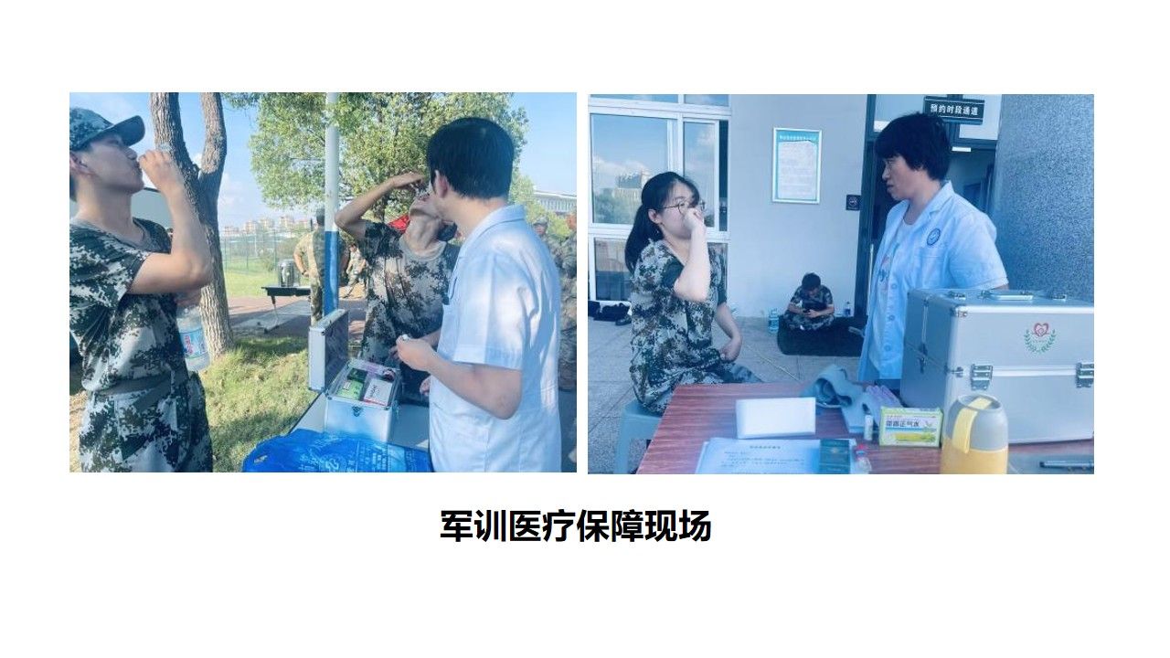 紧随其后的新生军训是对学生意志和体力的双重考验。卫生保健科高度重视军训期间的医疗保障任务,不仅制作2025年度学生军训期间健康保障的温馨告知书,在训练场还设立了两个医疗保障服务点,配备充足的常用药品、急救设备(如AED、医用冰袋、医用便携式氧气瓶)和经验丰富的医护人员,实行值班值守。针对高温、高强度训练可能引发的中暑、擦伤、扭伤等常见情况,医护人员时刻保持高度警惕,做到第一时间响应、迅速妥善处置。在军训现场,他们为出现身体不适的同学提供及时、专业的医疗服务和温暖的关怀,有力保障了军训工作的顺利进行。