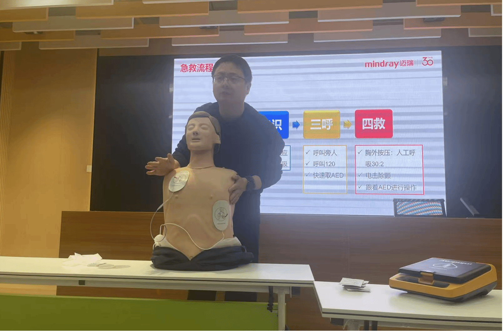 会上,培训专家阐明了危急情况下实施心肺复苏、急救的重要性,并采用PPT的展示、现场互动、急救技能实操等演示方式,向老师们普及AED 的使用注意事项及规范化操作方法。同时,详细讲解了突遇心搏骤停病人应采取的急救措施,并在现场进行心肺复苏及AED演示培训。