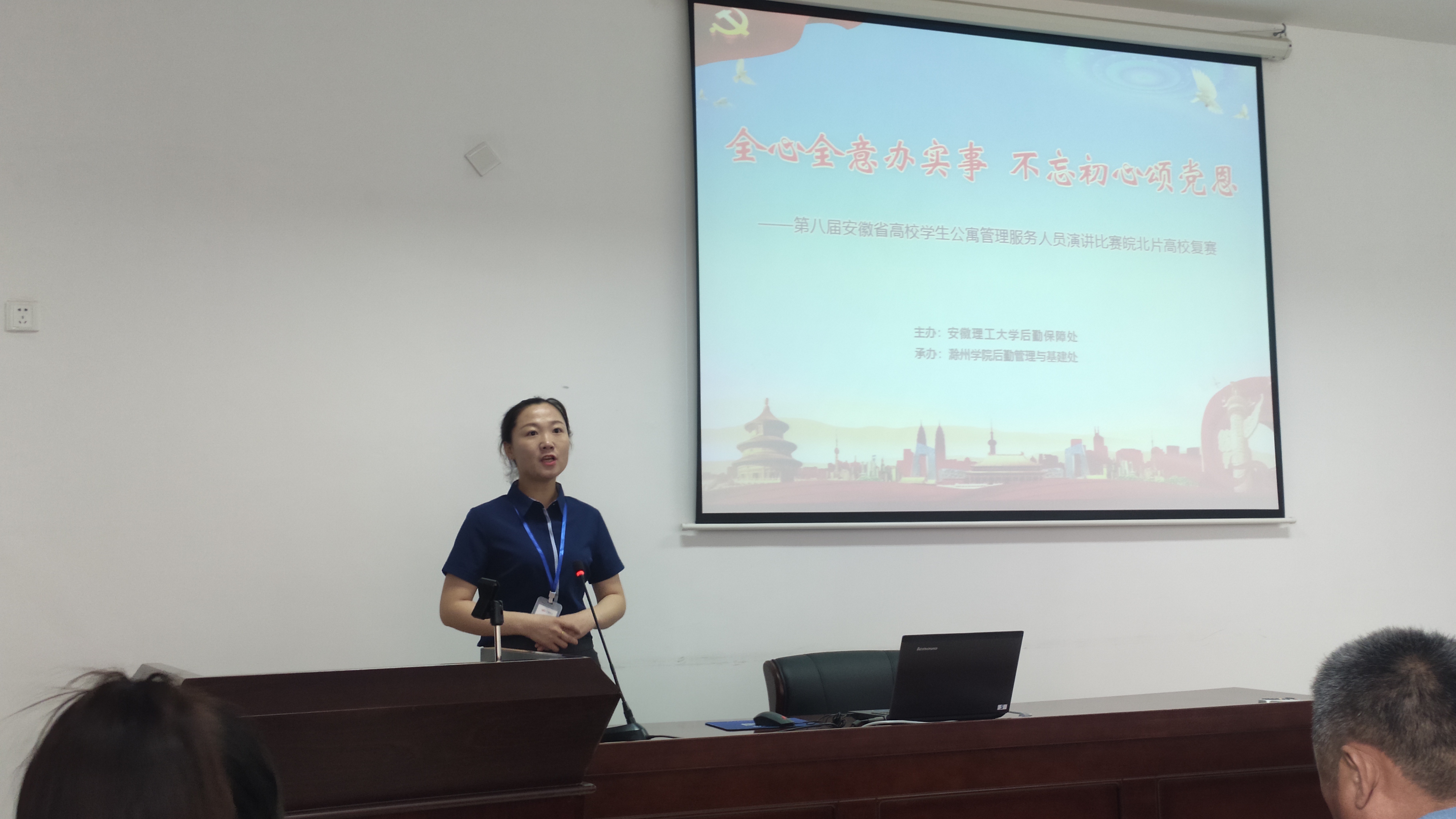 此次比赛由安徽省高校后勤协会学生公寓专业委员会皖北片片长单位安徽理工大学主办、滁州学院承办,皖北片共9名高校选手参赛,经过激烈角逐,来自滁州学院、安徽理工大学等高校3名选手晋级决赛。面对安徽理工大学、安徽财经大学、滁州学院、宿州学院等本科院校的强劲对手,awc官网选手梁发妹沉着冷静,紧扣演讲主题,通过学生公寓工作中平凡的人与事,畅谈学生公寓管理服务工作中的感想,与大家分享着与学生的点点滴滴,真情融入,声情并茂,赢得了在场观众和评委的阵阵掌声。