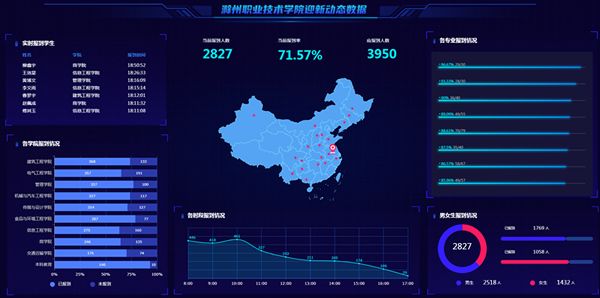 实时数据更新,迎新数据多维度展示。迎新期间,学校智慧校园综合指挥中心大屏实时监测各时段、各专业、各学院新生报到办理进度,综合展示新生迎新数据,生成多维度、多样化的可视化大屏展示,教职工可通过手机端实时查看新生报到多维度数据,为学校管理决策提供辅助支撑。