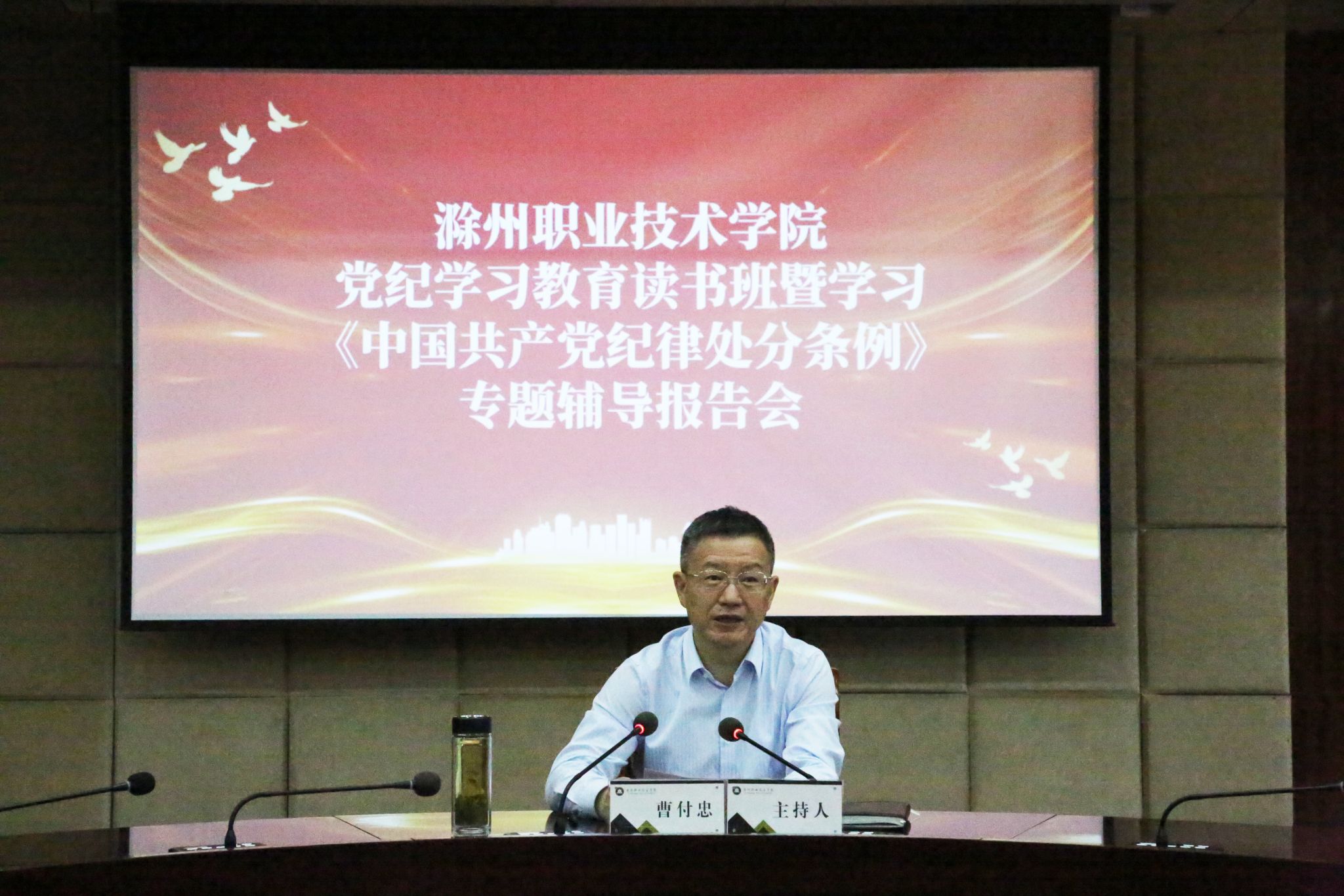 5月16日上午,学校在综合楼十一楼会议室举行党纪学习教育读书班开班式暨学习《中国共产党纪律处分条例》专题辅导报告会,校党委书记曹付忠主持会议并讲话。校党委副书记、校长许雪峰,校党委副书记杨家庆,校领导孙静、胡凼、李平权、王冬、王宇,各教学院部、各部门主要负责同志出席会议。