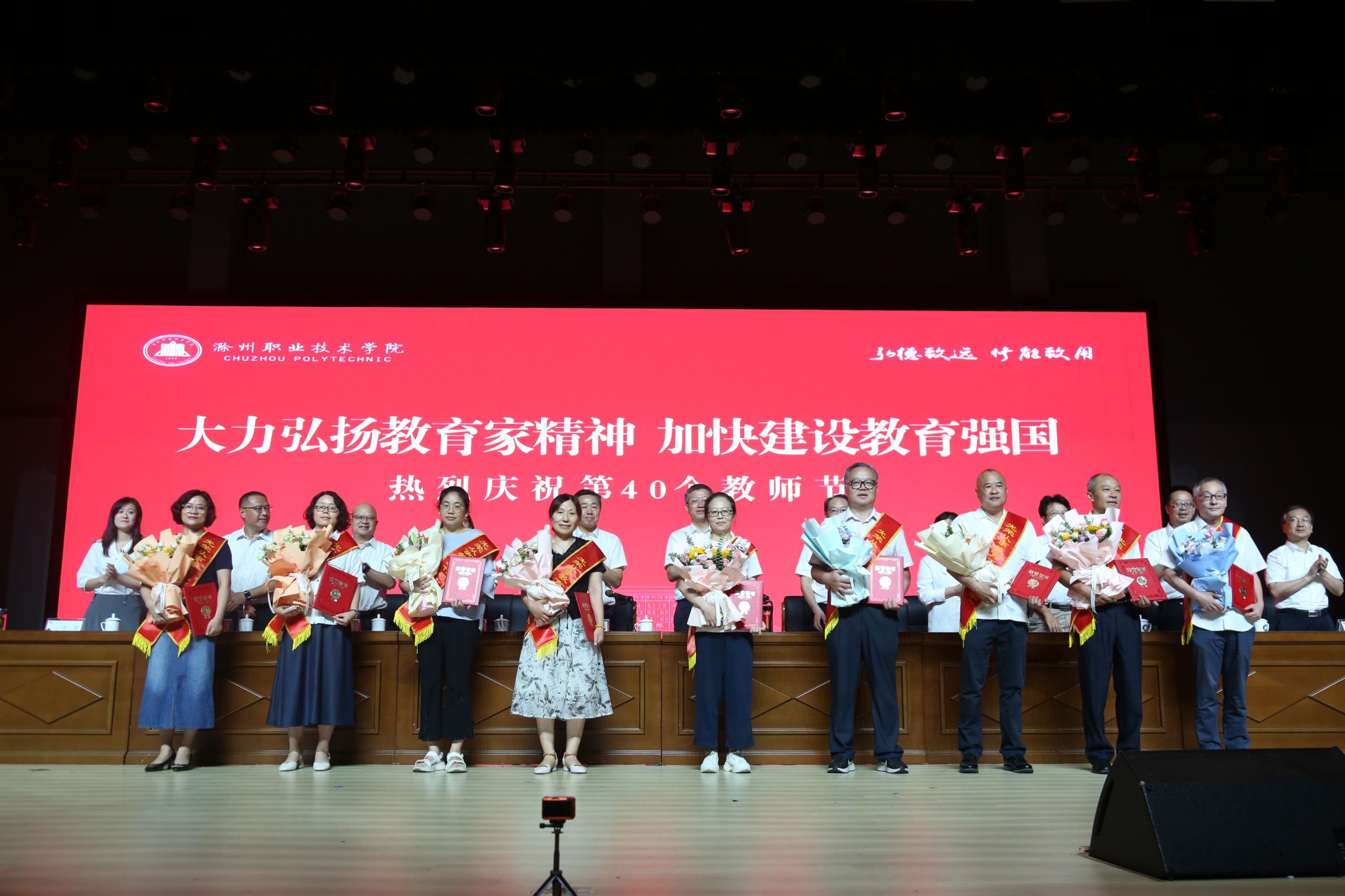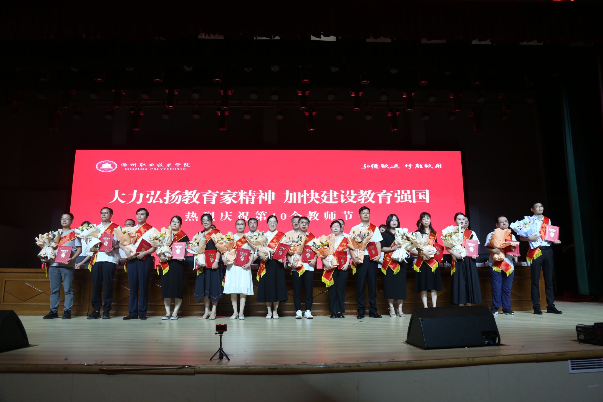 与会人员共同观看了《弘扬教育家精神 展滁职教师风采》宣传片。校党委副书记杨家庆宣读了表彰文件,张小光等22名老师获得“优秀教师”称号,付金凤等2名老师获得“优秀思政课教师”称号, 袁一等5名老师获得“优秀辅导员”称号。大会还为陈开兵等10名从事教书、育人、管理、服务工作满二十五、三十周年的教职工颁发纪念证书。