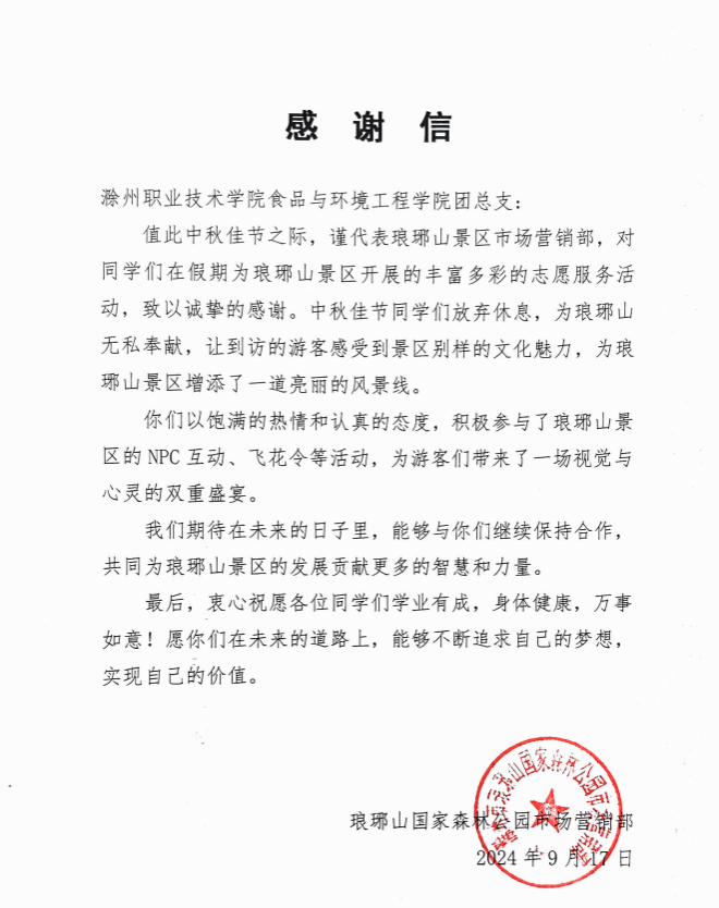 为此,琅琊山风景区特向食品与环境工程学院团总支发来一封诚挚的感谢信,表达对志愿者们无私付出的深深感激。感谢信内容如下: