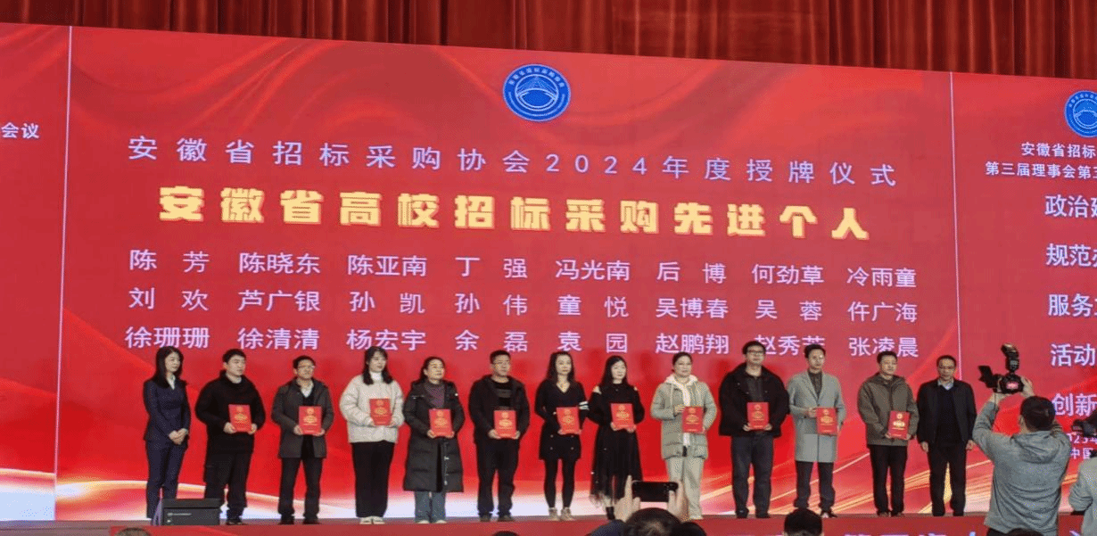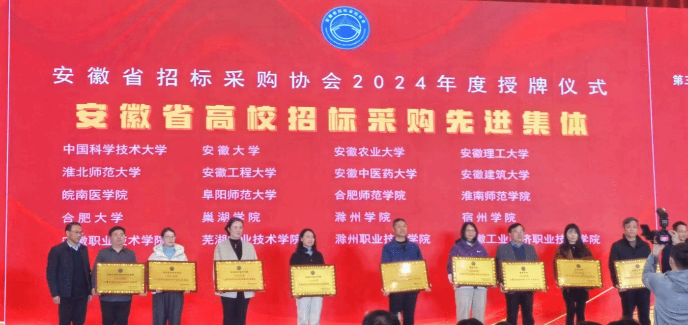 近日,在由安徽省招标采购协会主办的安徽省招标采购协会第三届理事会第五次(扩大)会议暨2024年度安徽省高校采购论坛上,awc777万象城娱乐官网凭借在招标采购领域的卓越表现和规范化管理,荣获“2024年度安徽省高校招标采购先进集体”称号。同时,awc官网招标采购办的陈芳同志被评为“2024年度安徽省高校招标采购先进个人”。
