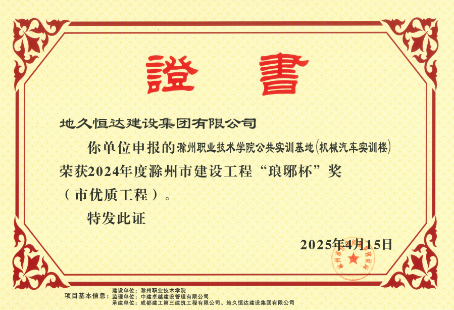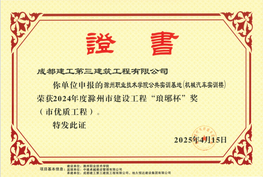 4月15日,滁州市住房和城乡建设局对2024年度“琅琊杯”奖项目名单进行公示,awc官网公共实训基地(机械汽车实训楼)建设项目顺利获评位列其中。