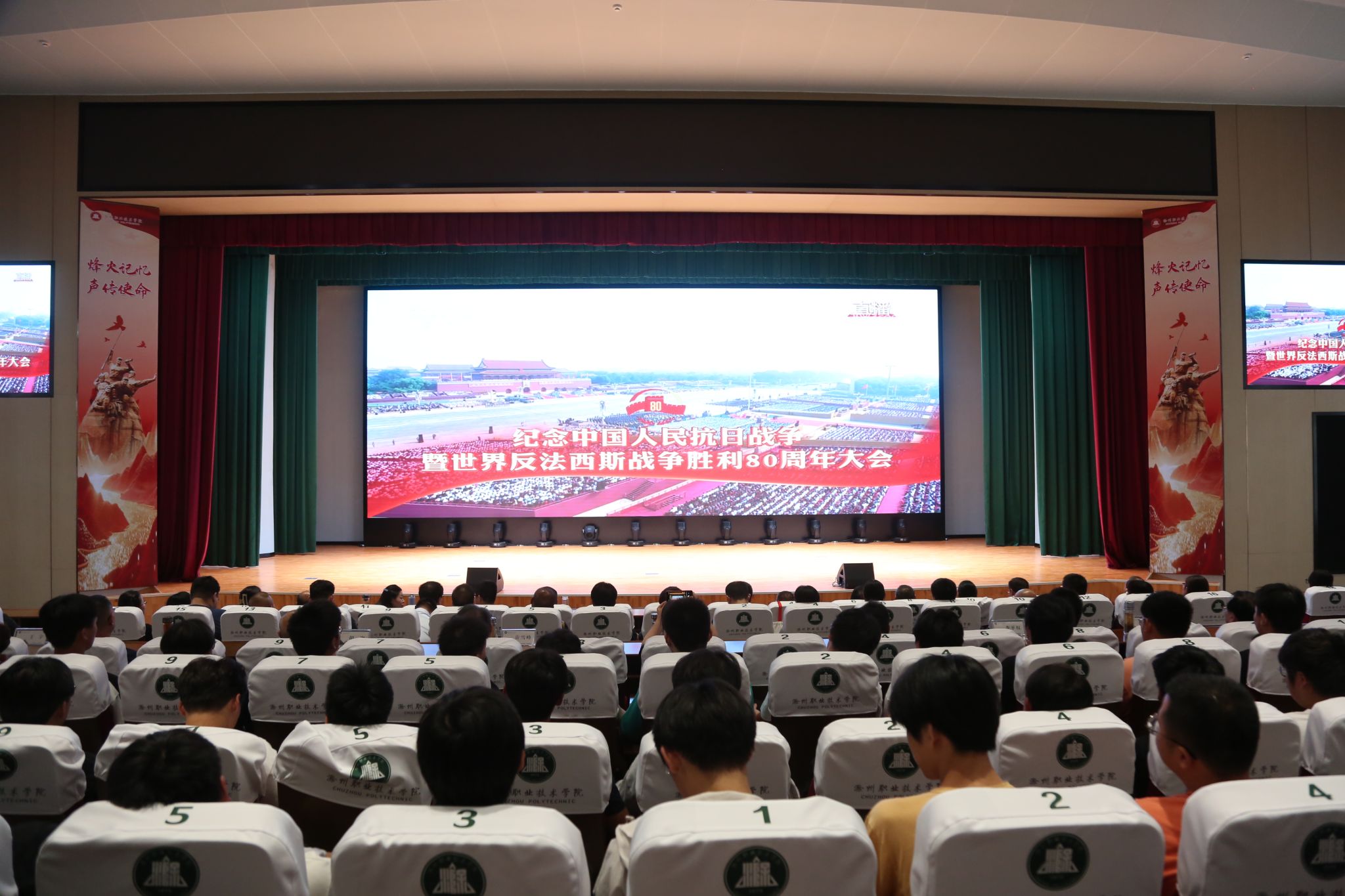 9月3日上午,纪念中国人民抗日战争暨世界反法西斯战争胜利80周年大会在天安门广场隆重举行。中共中央总书记、国家主席、中央军委主席习近平发表重要讲话并检阅部队。学校组织全校师生在6号楼报告厅共同观看实况直播。全校各二级党组织精心组织师生员工集中收看。广大师生怀着无比崇敬和激动的心情,凝神观看气势恢宏的阅兵场面。习近平总书记指出要“铭记历史、缅怀先烈、珍爱和平、开创未来。”“维护共同安全,消弭战争根源,不让历史悲剧重演!”“中华民族伟大复兴势不可挡!人类和平与发展的崇高事业必将胜利!”让在场师生们心潮澎湃、备受鼓舞。阅兵仪式上,受阅官兵齐声高呼“正义必胜!和平必胜!人民必胜!”声声有力,句句铿锵,令人振奋。观看直播后,大家还纷纷围绕大会盛况展开热烈讨论。