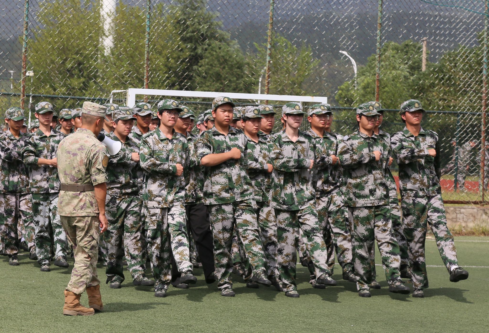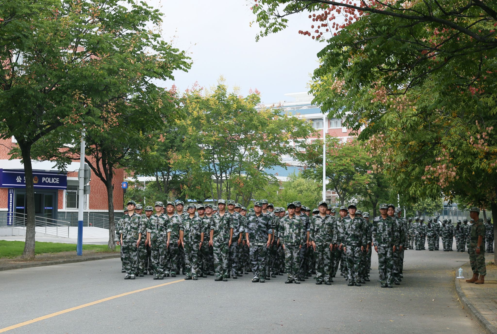 训练场上,6000余名新生以连队为单位,在教官的指令下开展立正稍息、齐步走等基础队列训练,动作整齐划一、精神饱满昂扬。部分连队还利用训练间隙组织军歌学唱、拉歌互动等活动,嘹亮的歌声与整齐的口号声交织,展现出新生们积极融入集体、勇于接受磨砺的青春态度。带训辅导员全程坚守在训练一线,时时留心新生训练动态,为军训工作有序推进提供有力支撑。