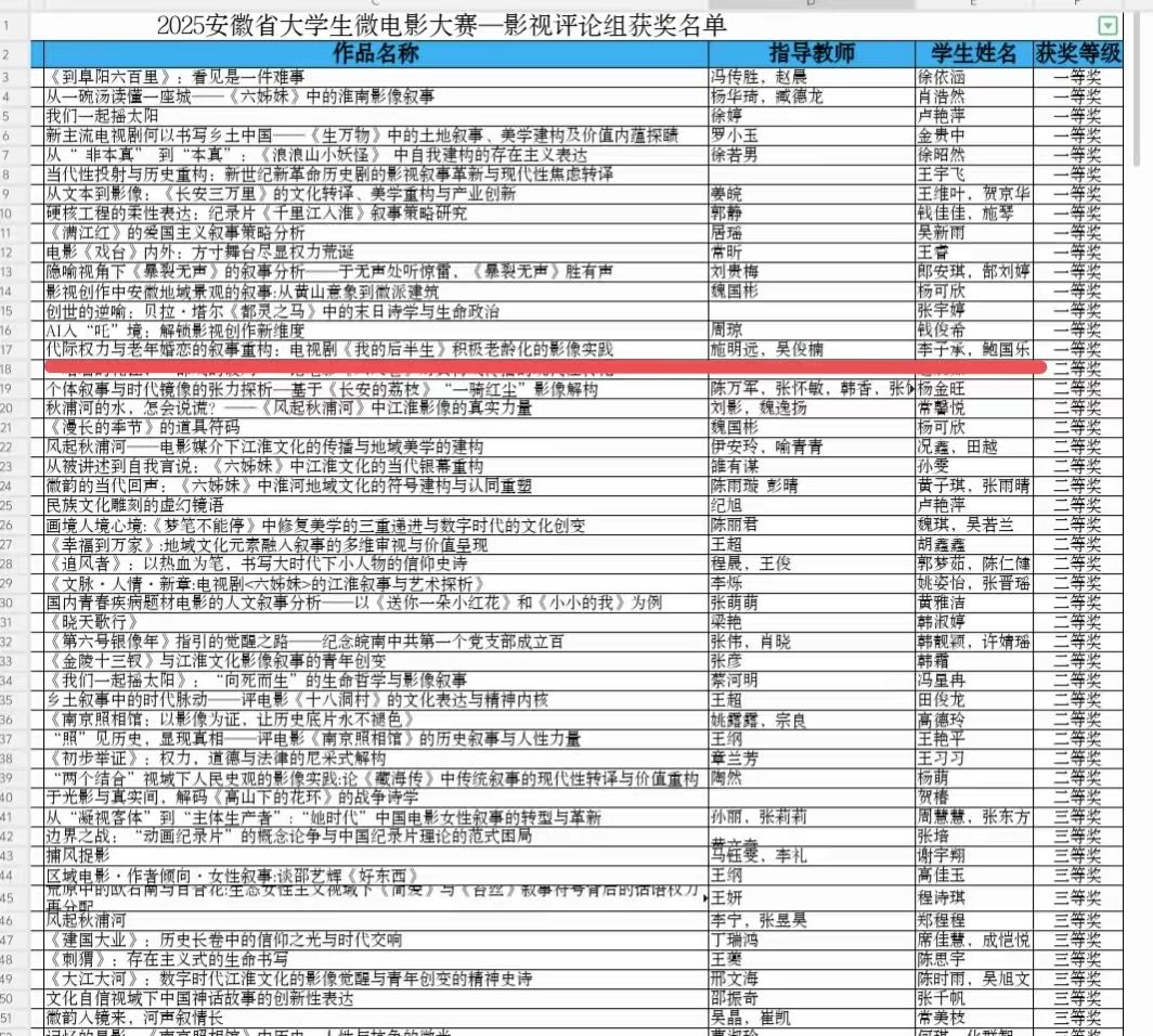 近日,2025年安徽省大学生微电影大赛获奖名单正式公示,由食环学院辅导工作室负责人施明远、吴俊楠老师指导,学生李子承、鲍国乐参与的影视评论作品《代际权力与老年婚恋的叙事重构:电视剧〈我的后半生〉积极老龄化的影响实践》,在全省百余件参赛作品中脱颖而出,成功斩获省级一等奖,两位指导老师荣获优秀指导教师奖。