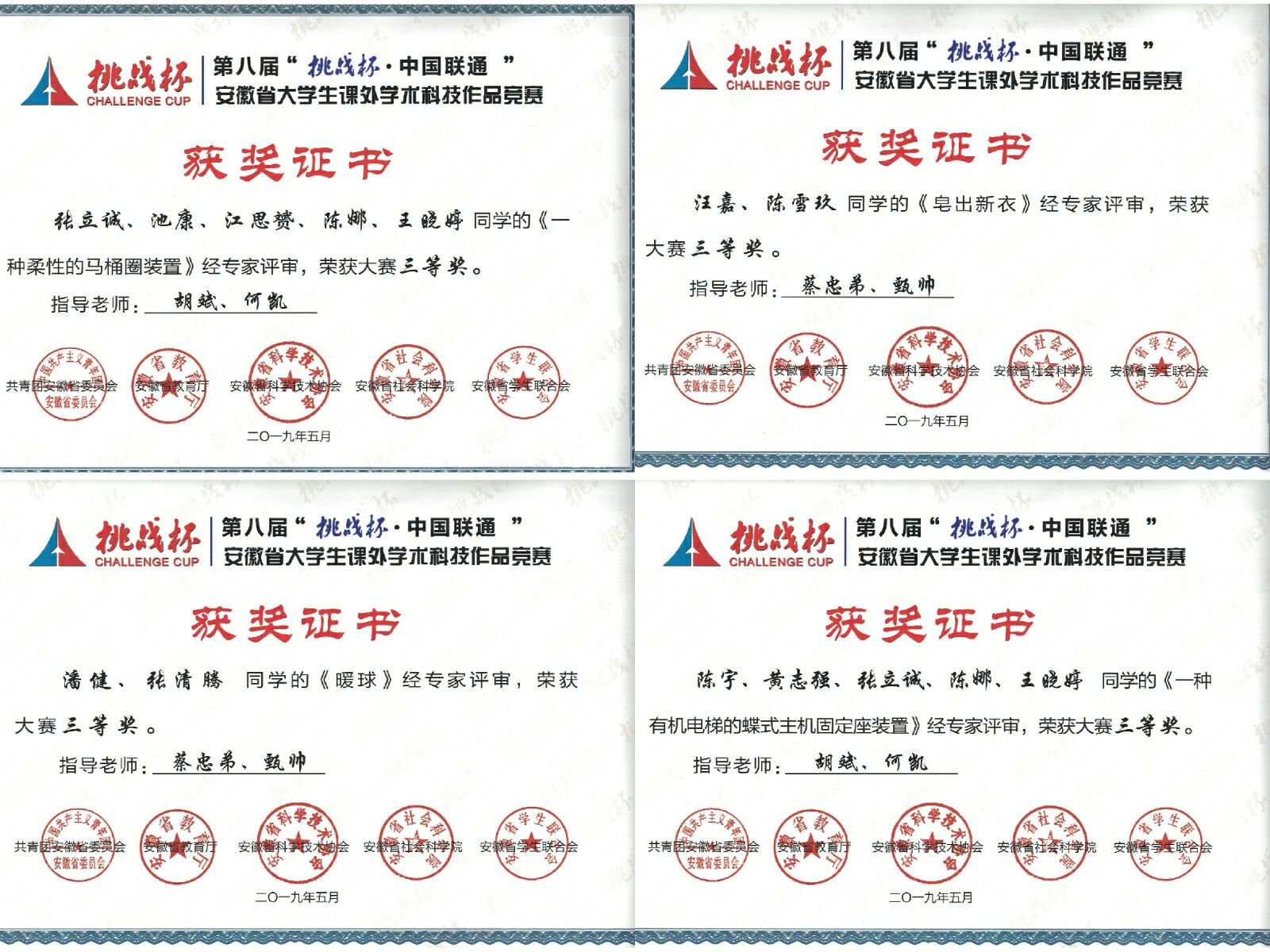 为了推动大学生创新创业素质教育,全面提高学生综合素质,充分展示学生风采,营造良好的校园文化氛围,5月27日,安徽省第八届“挑战杯·中国联通”大学生课外学术科技作品竞赛在合肥工业大学圆满落幕。awc官网8件作品成功获得高职组创意设计竞赛奖项。