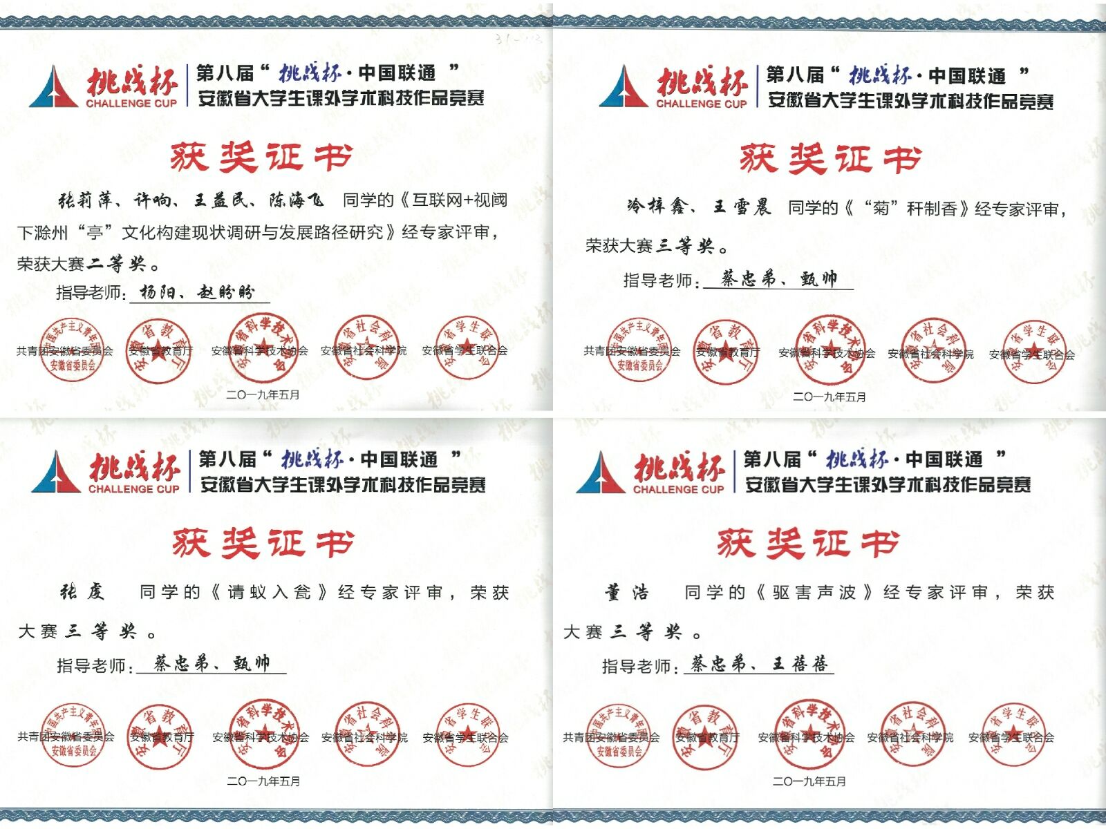 经过激烈的角逐和决赛专家评审,张莉萍、许响、王益民、陈海飞同学的《互联网+视阈下滁州“亭”文化构建现状调研与发展路径研究》荣获大赛二等奖。董浩同学的《驱害声波》、张虔同学的《请蚁入瓮》,冷梓鑫、王雪晨同学的《“菊”秆制香》,陈宇、黄志强、张立诚、陈娜、王晓婷同学的《一种有机电梯的蝶式主机固定座装置》,潘健、张清腾同学的《暖球》,张立诚、池康、江思贽、陈娜、王晓婷同学的《一种柔性的马桶圈装置》,汪嘉、陈雪玖同学的《皂出新衣》荣获三等奖。