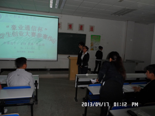 4月17日下午,土木工程系2013年创业大赛决赛在四号楼4104教室举行。经过前期的选拔和初赛、复赛,共角逐出了来自我系各个班级的10个创业小分队参加此次决赛。 我系举办此次大学生创业大赛,有助于同学们将理论与实践相结合,增强实践能力和动手能力的培养,丰富实践教学的内容和形式,有利于集体精神和团队精神的培养,有助于同学们毕业后的自主择业和创业。 我系希望通过此次比赛,动员广大学生投身到创新创业实践中来,同时,积极促进学生创新创业成果的转化,为同学们实现创业梦想提供良好环境和条件。