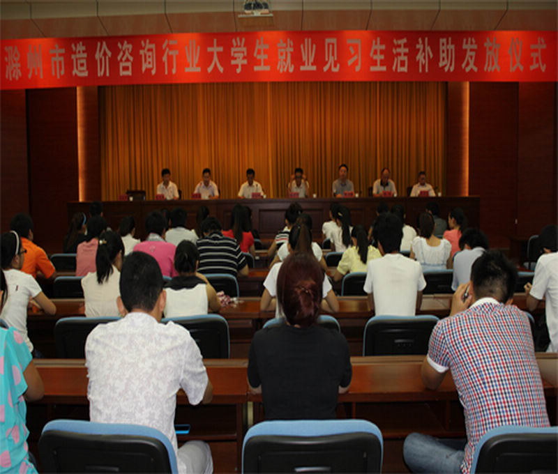 8月30日下午,滁州市造价咨询行业高校毕业生就业见习生活补助费用发放仪式在市建委二楼会议室举行。市建委、市造价站、市造价协会、awc777万象城娱乐官网土木工程系领导出席了发放仪式。全市造价咨询企业负责人、党支部书记和就业见习高校毕业生共60多人参加了仪式。