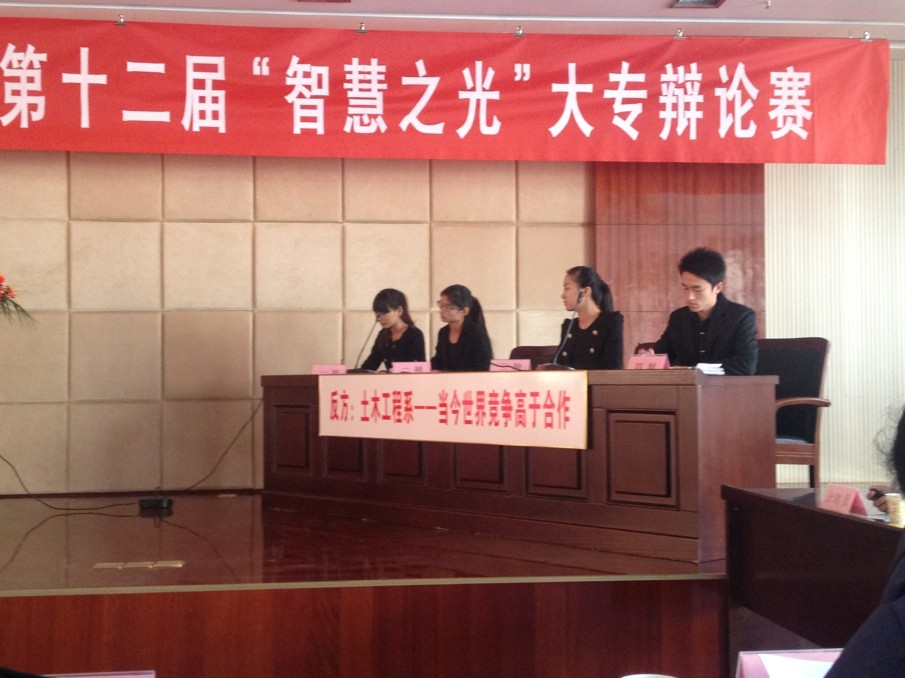 在前面几轮的初赛、复赛角逐中,土木系代表队不负众望连胜两场,得到了和经济贸易系在决赛进行巅峰对决的机会。当天下午的决赛中,两支队伍的表现都非常精彩,在紧张的环节中,双方争锋相对,步步紧逼,现场气氛迅速升温,达到白热化阶段。我系选手们精辟的措辞,犀利的言辞,展现出咄咄逼人的气势。我系邹小东,吴楠楠,范宇,蒋丹丹四位辩手们清晰的思路和巧妙的陈词给观众留下了深刻的印象。最终我系以完美的表现获得最终的胜利,取得了此次全院第十二届大专辩论赛的冠军。