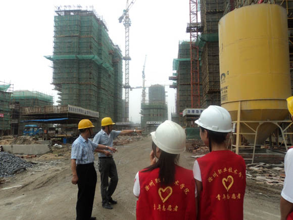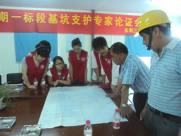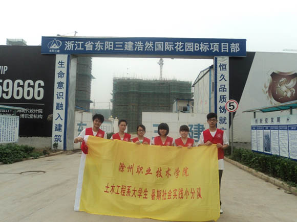 今年暑期土木系的社会实践活动第二个实践地点是位于滁州市花园路的浩然国际在建住宅小区。 7月5日一早,我系实践队的6名同学就在系团总支徐老师的带领下来到了工地项目部门口,在得到工程部负责人的热情接待后,开始了系统的参观学习。