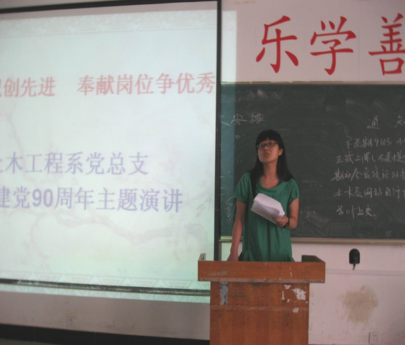 6月23日下午,土木工程系在4101多媒体教室举行了一场“立足本职创先进、奉献岗位争优秀”的主题演讲活动,系总支全体党员及学生入党积极分子参加了本次演讲活动,活动由系学生支部书记吴铭老师主持,学生党员刘云龙、赵维诚结合学生学习作了精采演讲;汪雪梅老师演讲的关于歌颂沈浩的电视剧《永远的忠诚》观后感引起了全场师生共鸣,活动在雷鸣般的掌声中结束。