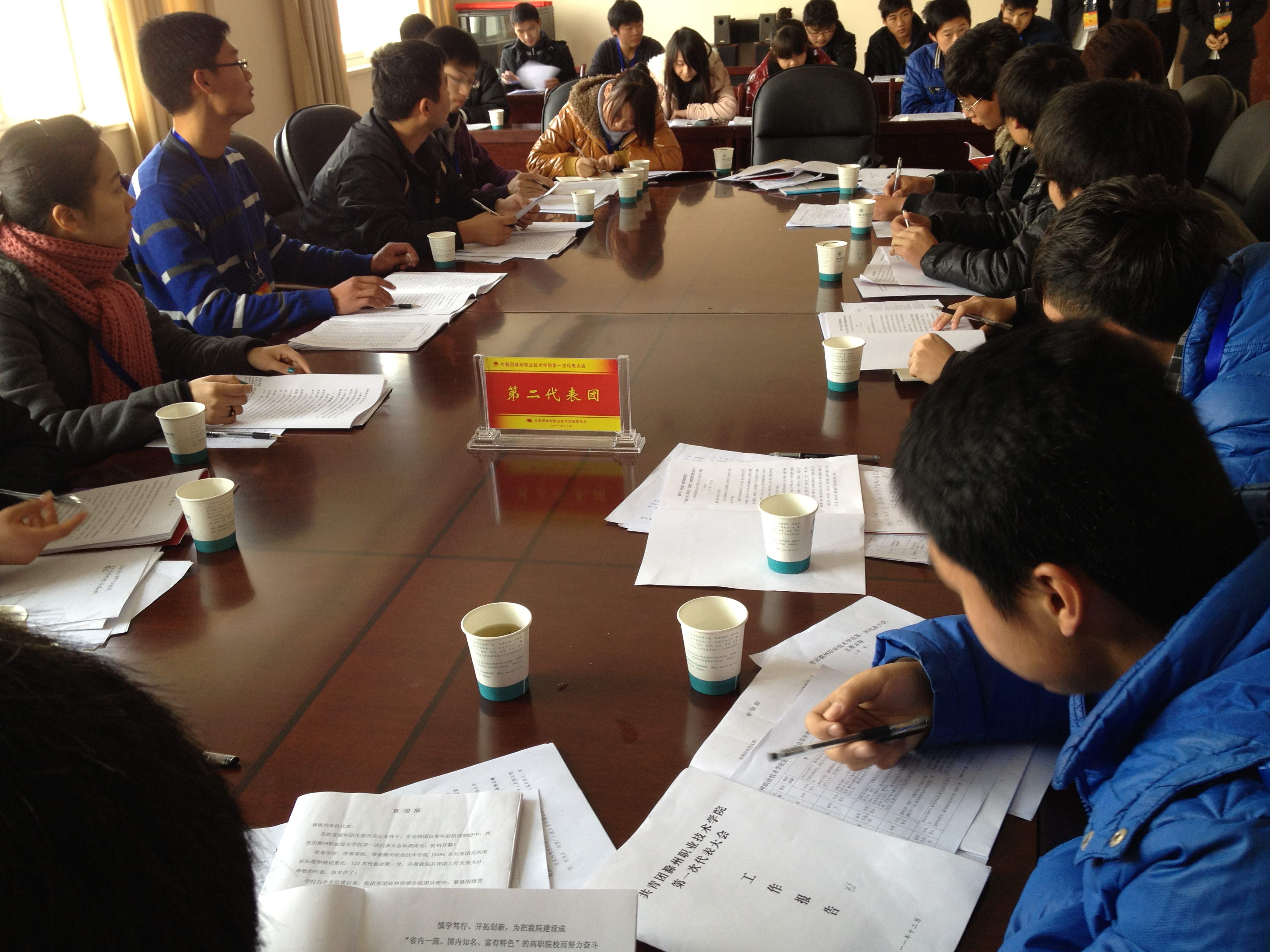 图为土木系第二代表团在讨论大会工作报告