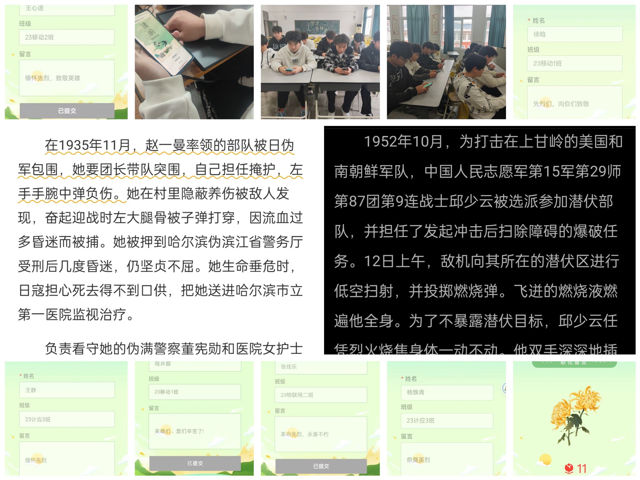 活动中,各班级团支部组织开展了丰富多彩的主题团日活动。23移动互联2班等班级开展清明节主题班会,通过观看纪录片、讲述革命故事等形式,让同学们了解革命先烈的英勇事迹,感受他们为民族独立和人民幸福所做出的巨大贡献。23物联网2班等班级开展了清明节主题诗歌朗诵会,同学们用激昂的朗诵声表达了对革命先烈的敬仰之情。此外,以团支部为单位组织开展了线上祭英烈活动,同学们通过网络平台向革命先烈献花、留言,表达自己的敬意和感激之情。有的同学还自发地分享了革命先烈的感人故事,让更多的人了解他们的英勇事迹。同学们纷纷表示,要珍惜今天的幸福生活,努力学习,为祖国的繁荣富强贡献自己的力量。