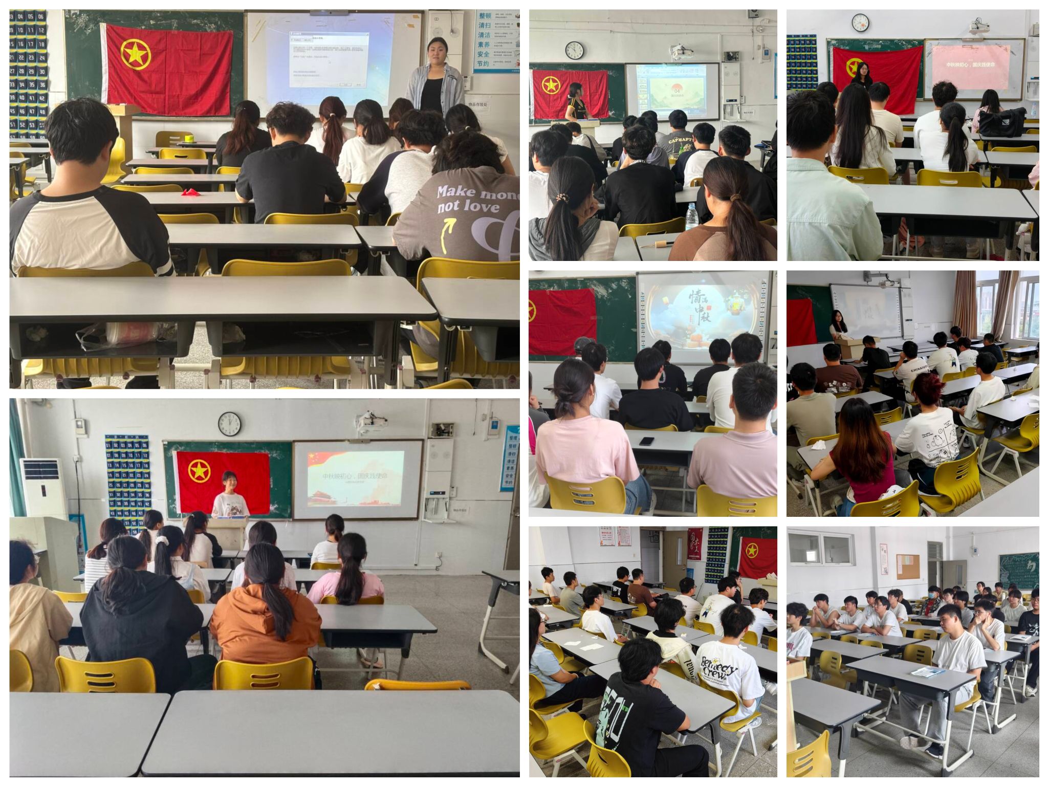 活动形式多样、内容丰富。24虚拟现实等支部通过播放双节主题混剪短片,与同学们共同了解中秋习俗与国庆历史。24软件3班等支部则借助PPT,生动讲解中秋节的起源、发展、传统习俗及其文化内涵,并阐释国庆节“家国同庆”的深刻意义。现场氛围浓厚,同学们沉浸其中,进一步加深了对家国情怀的理解与认同。