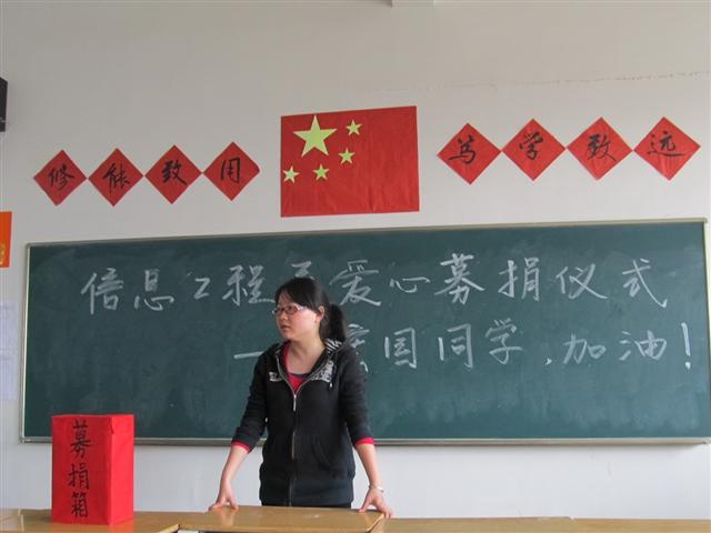 一方有难,八方支援,信息系各团支部得知我院艺术系刘宏国同学家庭的遭遇后,立刻行动起来组织爱心募捐。2011年4月14日下午,我系团总支专门组织了“爱在这里传递”的捐款仪式,各支部书记将从班级里汇集来的拳拳爱心郑重地投入了捐款箱,并在黑板上写下:“刘宏国,加油!”的字样,希望能够为帮助刘宏国同学家人早日战胜困难尽到自己绵薄之力。