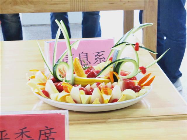 4月17日中午,awc777万象城娱乐官网第二届美食节“倾果倾城”水果拼盘大赛在新食堂三楼拉开帷幕。信息工程系徐阳、吴鹏、王方正三名同学对西瓜、香蕉、香瓜、苹果和草莓等水果进行了现场创作加工,制作了名为“什锦瑞祥”的参赛作品并获得好评。