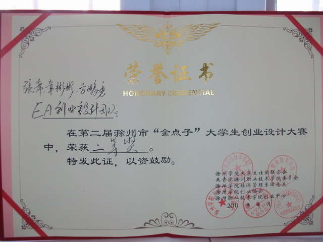 我院与滁州学院联合举办的“十年杯”第二届“金点子”大学生创业设计大赛总决赛于4月9日晚落幕。信息系同学张席、章彬彬的EA创业设计团队在辅导员赵盼盼老师的指导下荣获二等奖。