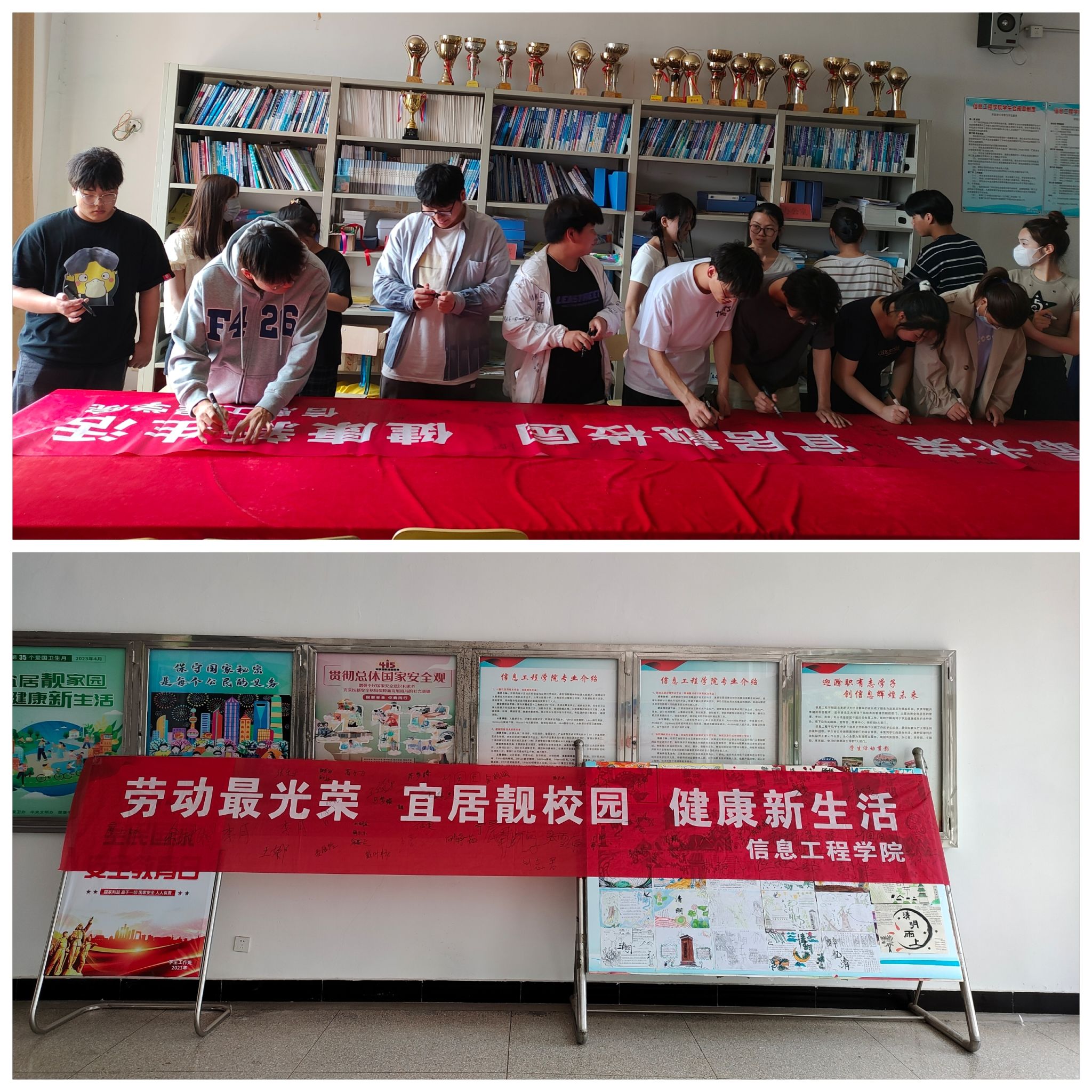 二是爱国卫生月主题签名活动。活动中,主持人介绍了爱国卫生月的历史,宣读了倡议书,随后同学们在“劳动最光荣 宜居靓校园 健康新生活”的横幅上签上自己的名字,纷纷表示今后要养成良好的学习生活习惯,营造整洁舒适的校园环境。