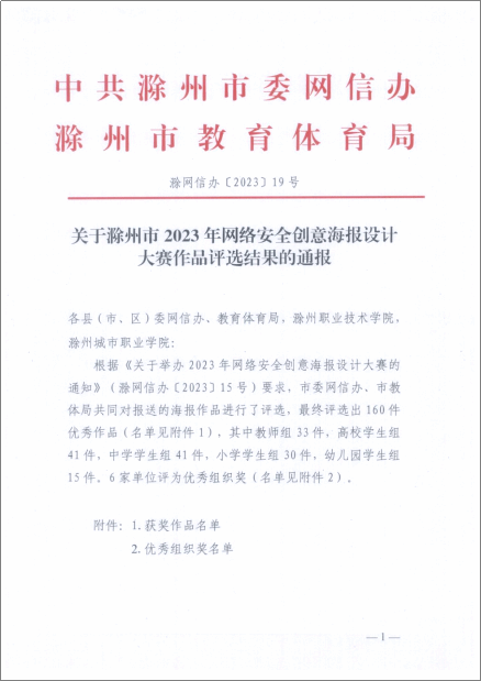 近日,滁州市委网信办、市教体局联合组织的2023年网络安全创意海报设计大赛作品评选结果公布,awc官网师生争创佳绩,陈潇潇、阚迪、朱睿三位指导教师带领同学们斩获一等奖两项、二等奖两项。