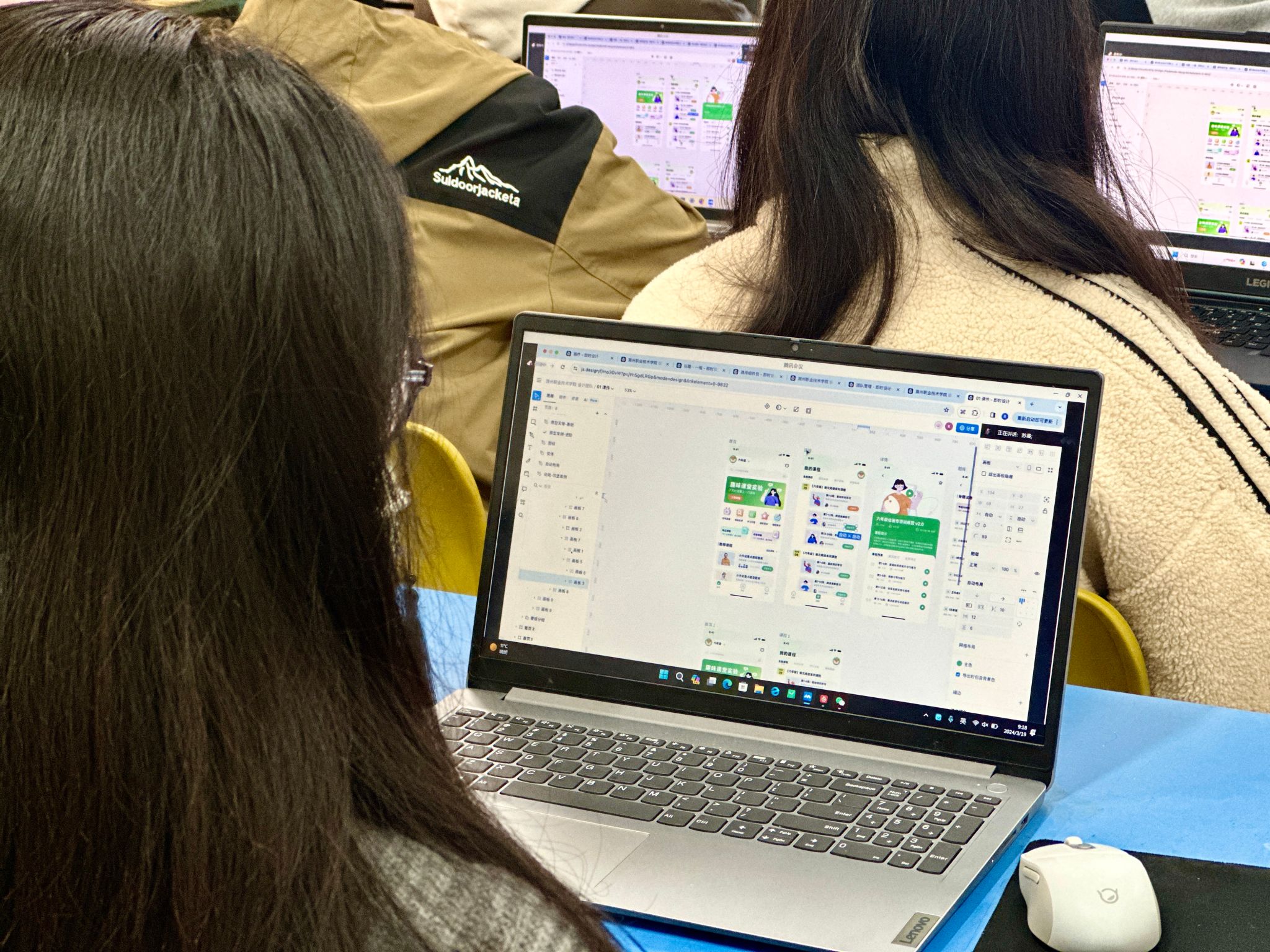 本次集训分为两大核心板块,苏老师首先从AIGC应用角度解读国家级竞赛真题中,企业、产品应当如何把握技术浪潮、将前沿技术与合适的应用场景结合,并快速建立自身的竞争力等方面给出了具体方法论和行动路径。其次,苏老师通过构建在线学习社区,以实时共享操作界面的方式,带同学们对全球首款全面开放的人工智能UI设计工具进行实操分步教学,同学们跟着老师教学步骤,了解并学会从设计稿的组成逻辑、演变情况,以及与设计目标的匹配,最后生成符合用户预期的成果。最后,同学们和企业老师进行了线上讨论和交流。