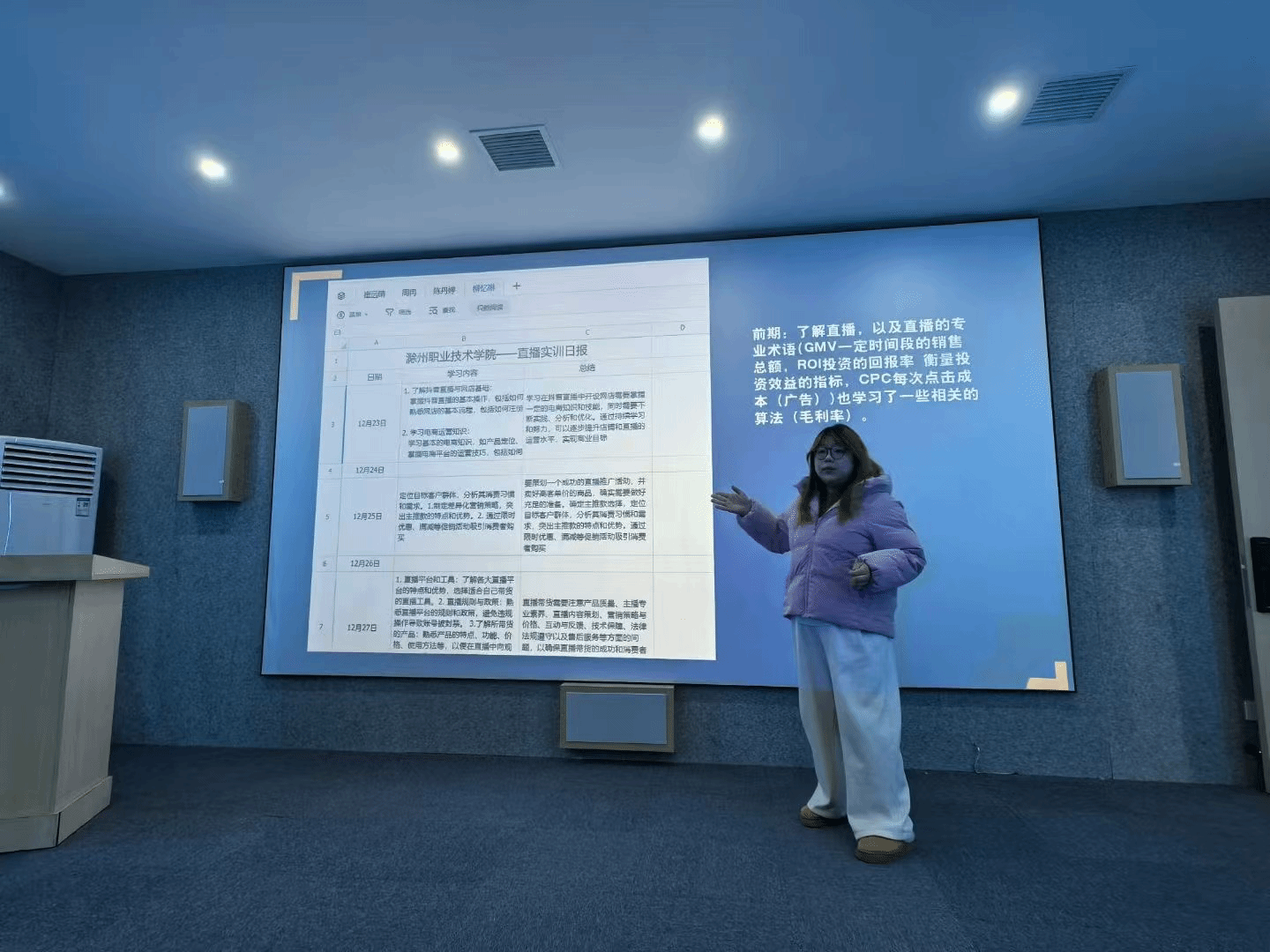 结业汇报会上,17名学生逐一上台,以饱满的热情和自信的姿态展示了他们的学习成果。其中,直播类汇报涵盖了从直播脚本设计、现场互动技巧到后期数据分析等多个环节,学生们通过生动的案例和翔实的数据以及亲身的实践案例,展示了他们在直播领域的专业素养和实践能力。