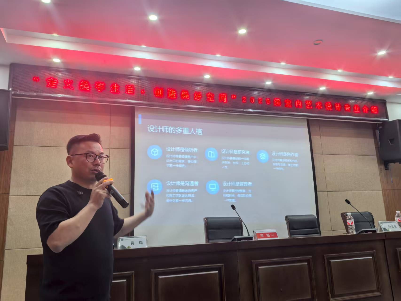 9月9日下午,传媒与设计学院在南阶205教室开展了主题为“定义美学生活,创造美好空间”的2025级室内艺术设计专业新生介绍会。院长闻建强、室内艺术设计专业负责人黄瑞及专任教师陈璐、王瑶、马庆峰、王佳慧参加,同时邀请了产业教授滁州市久烁装饰设计公司总经理周刚出席,与全体2025级新生共话专业前景,展望职业未来。介绍会由黄瑞主持。