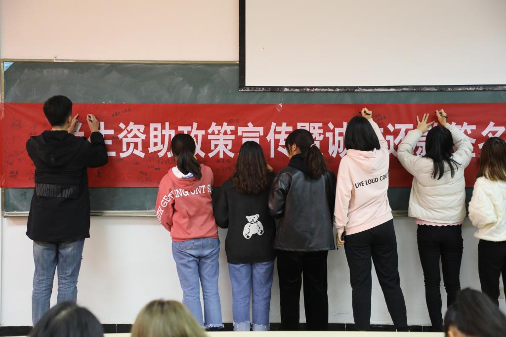 活动中,杜昌天就助学贷款的性质为大家进行了详细讲解,为确保国家政策顺利实施,让每一位贫困的大学生都享有资助政策,各班成立了贫困评议小组,杜绝掺杂个人感情进行评选,必须要做到公开公正公开,让真正贫困的同学得到相应的资助。杜昌天还提到大学生贷款要诚信还款,并安排同学们有序在横幅上签字,最后全体同学合影留念。