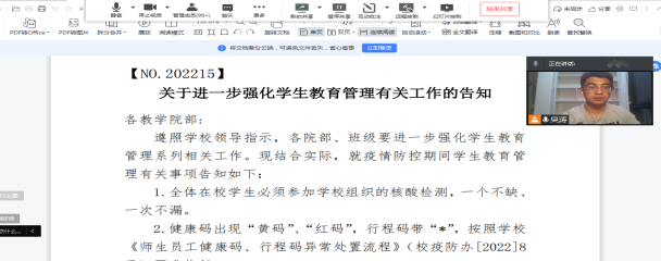 疫情就是命令,防控就是责任。近日,传媒与设计学院进一步落实强化学生教育管理有关工作,各班级辅导员利用在校学生下课期间、微信群、QQ群、腾讯会议等线上线下结合方式,开展疫情防控警示教育主题班会。
