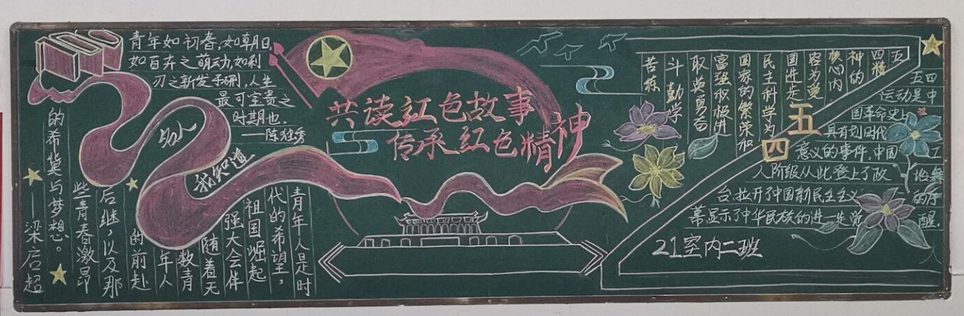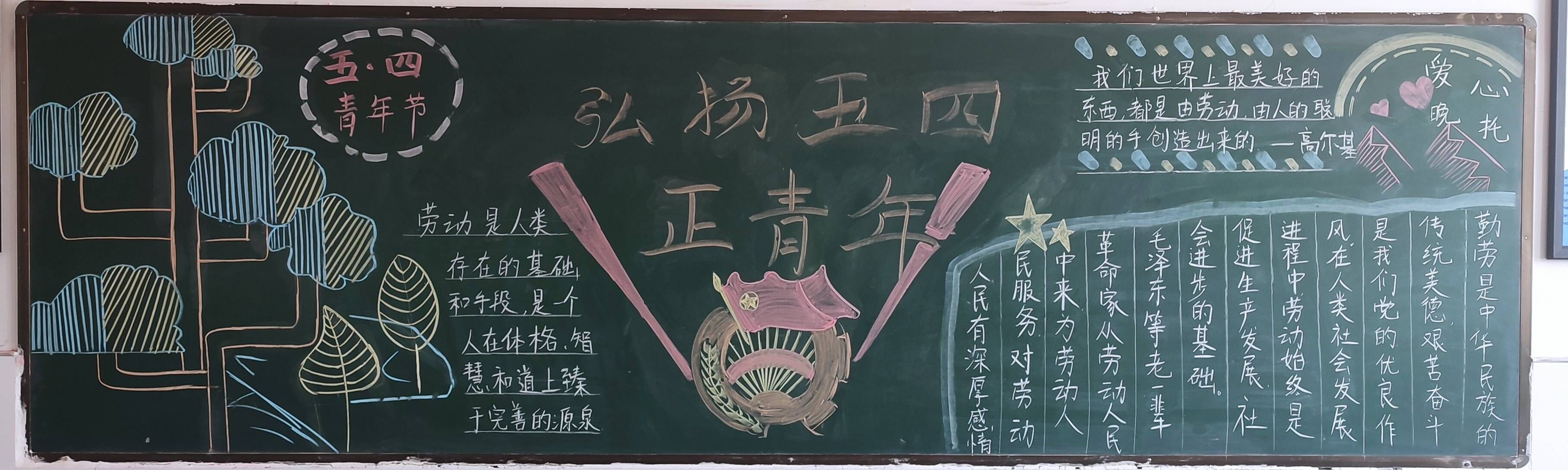 活动进行前,各班团支书带领同学们了解了五四青年节的来源,回顾了学生运动的事迹,以这些为素材,精心组织,努力呈现好的板报作品。活动中,同学们将板报加以完善,并且纷纷表达了要不畏艰难、冲锋在前、勇于探索、敢于创新、将爱国之情转化为报国之志的决心,要继承和发扬五四精神,担负起历史重任,让五四精神放射出更加夺目的时代光芒。